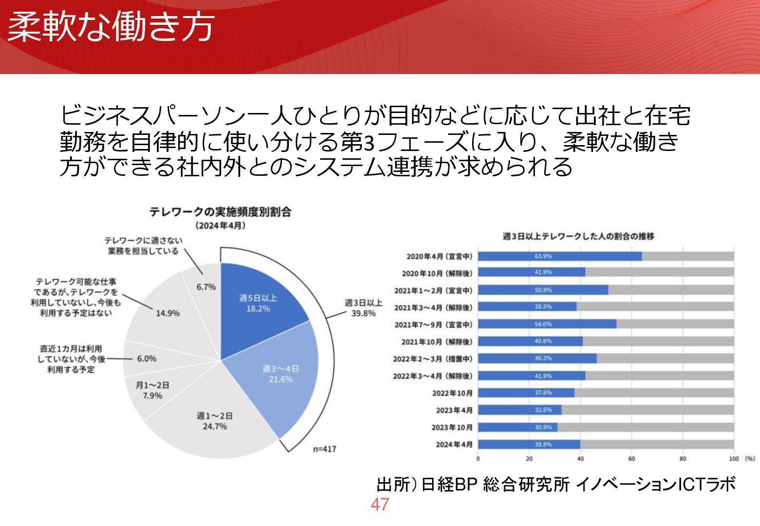 勤務を自律的に使い分ける第3フェーズに入り、柔軟な働き 方ができる社内外とのシステム連携が求められる 出所)日経BP 総合研究所 イノベーションICTラボ