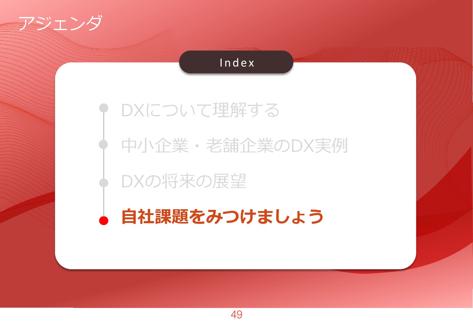 i’s FACTORY co., Limited index index I ndex アジェンダ 49 DXについて理解する 中小企業・老舗企業のDX実例 DXの将来の展望 自社課題をみつけましょう