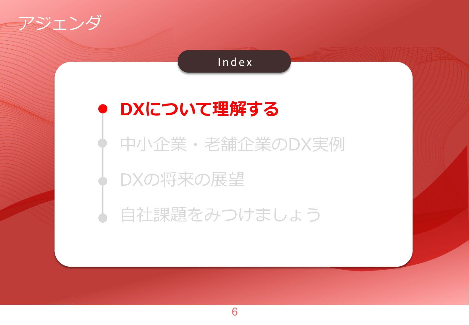 i’s FACTORY co., Limited index index I ndex アジェンダ 6 DXについて理解する 中小企業・老舗企業のDX実例 DXの将来の展望 自社課題をみつけましょう