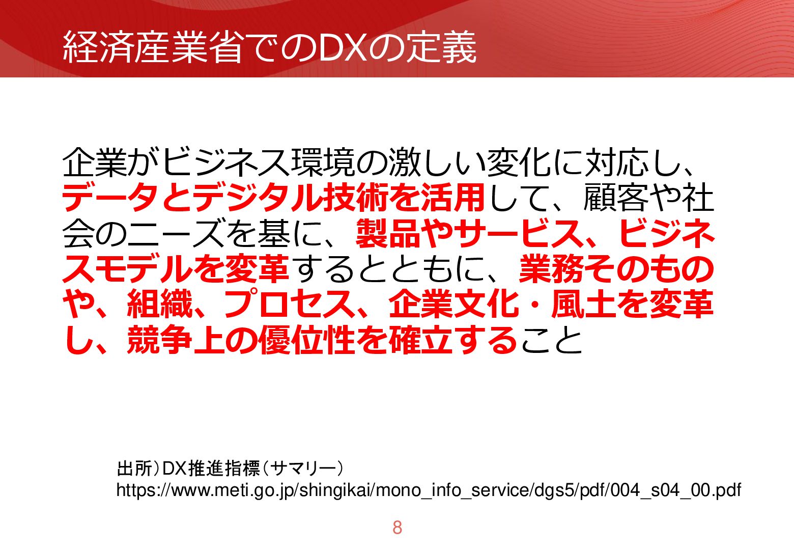 データとデジタル技術を活用して、顧客や社 会のニーズを基に、製品やサービス、ビジネ スモデルを変革するとともに、業務そのもの や、組織、プロセス、企業文化・風土を変革 し、競争上の優位性を確立すること 出所)DX推進指標(サマリー) https://www.meti.go.jp/shingikai/mono_info_service/dgs5/pdf/004_s04_00.pdf