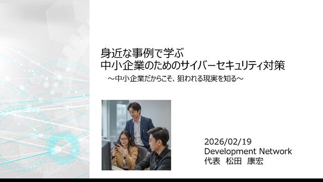 ⾝近な事例で学ぶ 中⼩企業のためのサイバーセキュリティ対策 〜中⼩企業だからこそ、狙われる現実を知る〜 2026/02/19 Development Network 代表 松⽥ 康宏