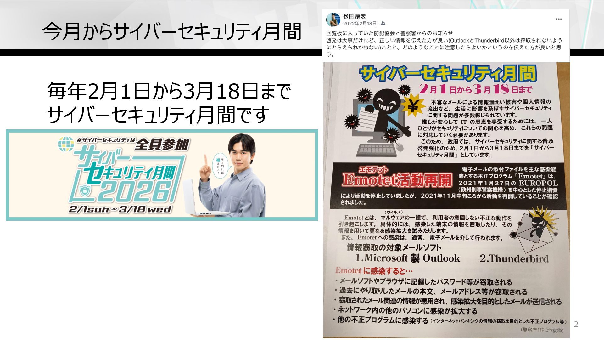 今⽉からサイバーセキュリティ⽉間 毎年2⽉1⽇から3⽉18⽇まで サイバーセキュリティ⽉間です 2