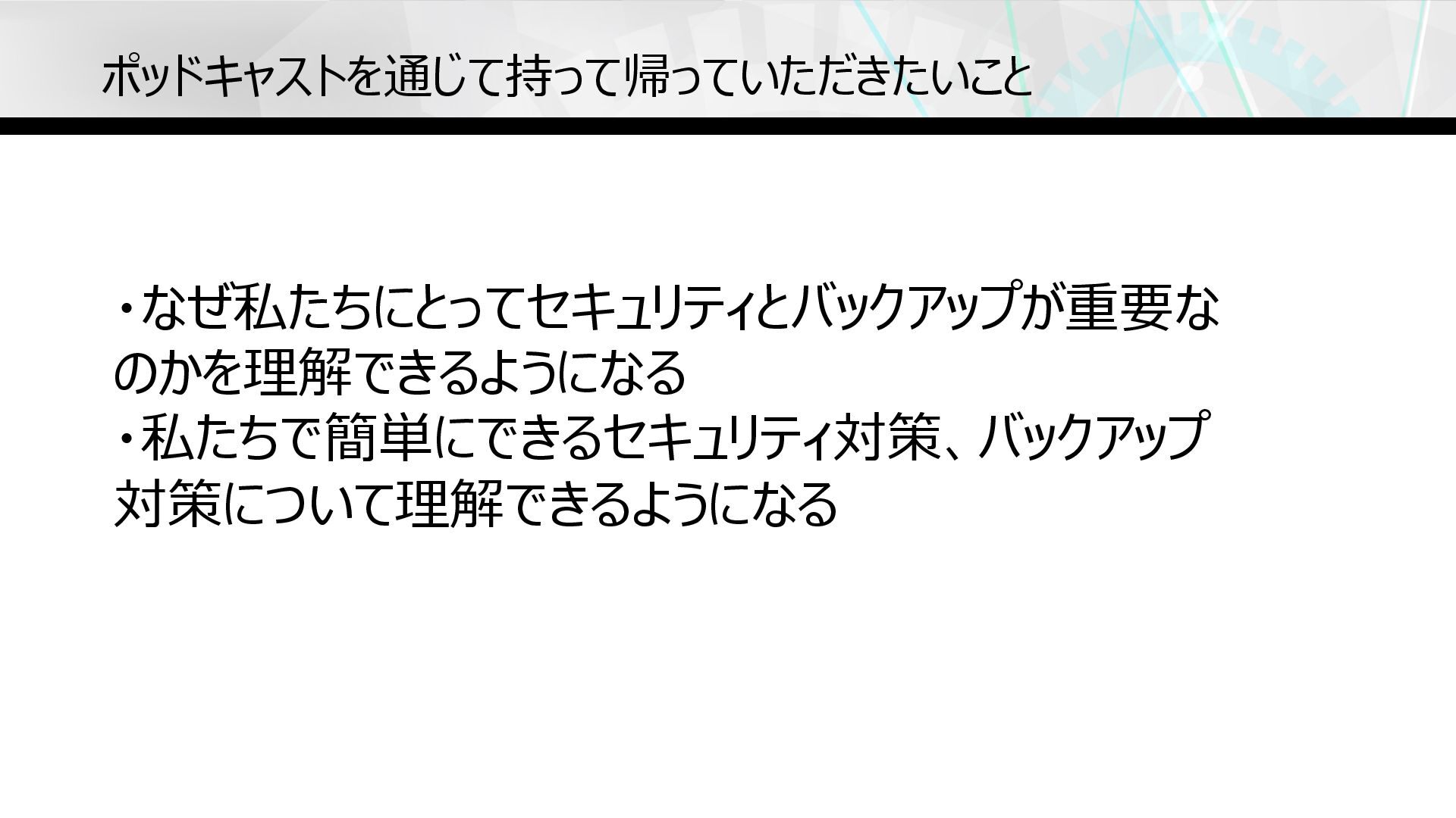 ポッドキャストを通じて持って帰っていただきたいこと ・なぜ私たちにとってセキュリティとバックアップが重要な のかを理解できるようになる ・私たちで簡単にできるセキュリティ対策、バックアップ 対策について理解できるようになる