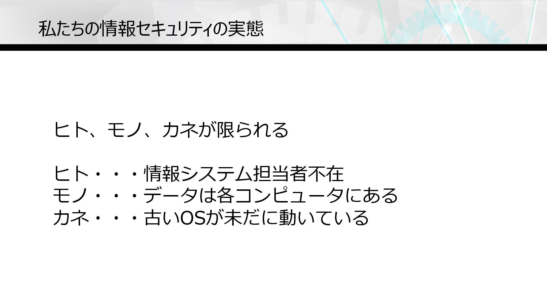私たちの情報セキュリティの実態 ヒト、モノ、カネが限られる ヒト・・・情報システム担当者不在 モノ・・・データは各コンピュータにある カネ・・・古いOSが未だに動いている