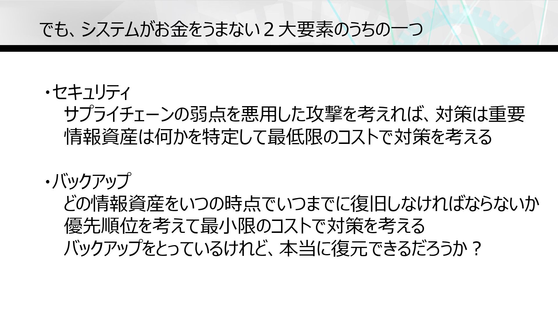 ・セキュリティ サプライチェーンの弱点を悪⽤した攻撃を考えれば、対策は重要 情報資産は何かを特定して最低限のコストで対策を考える ・バックアップ どの情報資産をいつの時点でいつまでに復旧しなければならないか 優先順位を考えて最⼩限のコストで対策を考える バックアップをとっているけれど、本当に復元できるだろうか︖ でも、システムがお⾦をうまない2⼤要素のうちの⼀つ