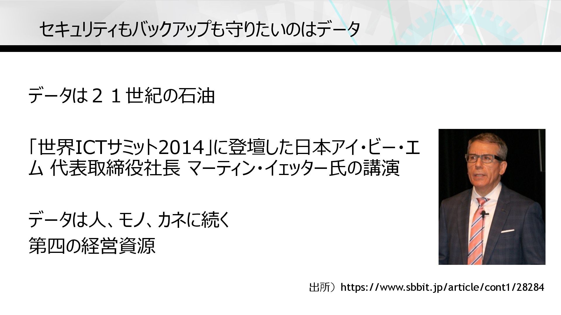 セキュリティもバックアップも守りたいのはデータ データは21世紀の⽯油 「世界ICTサミット2014」に登壇した⽇本アイ・ビー・エ ム 代表取締役社⻑ マーティン・イェッター⽒の講演 データは⼈、モノ、カネに続く 第四の経営資源 出所)https://www.sbbit.jp/article/cont1/28284