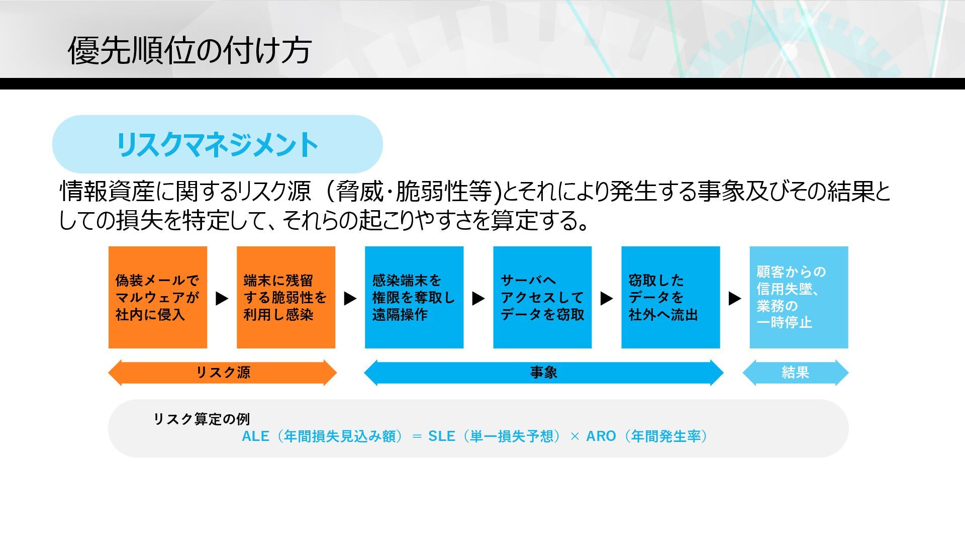 利⽤し感染 ▶ 感染端末を 権限を奪取し 遠隔操作 ▶ サーバへ アクセスして データを窃取 ▶ 窃取した データを 社外へ流出 ▶ 顧客からの 信⽤失墜、 業務の ⼀時停⽌ リスク源 事象 結果 リスク算定の例 ALE(年間損失⾒込み額)= SLE(単⼀損失予想)× ARO(年間発⽣率)
