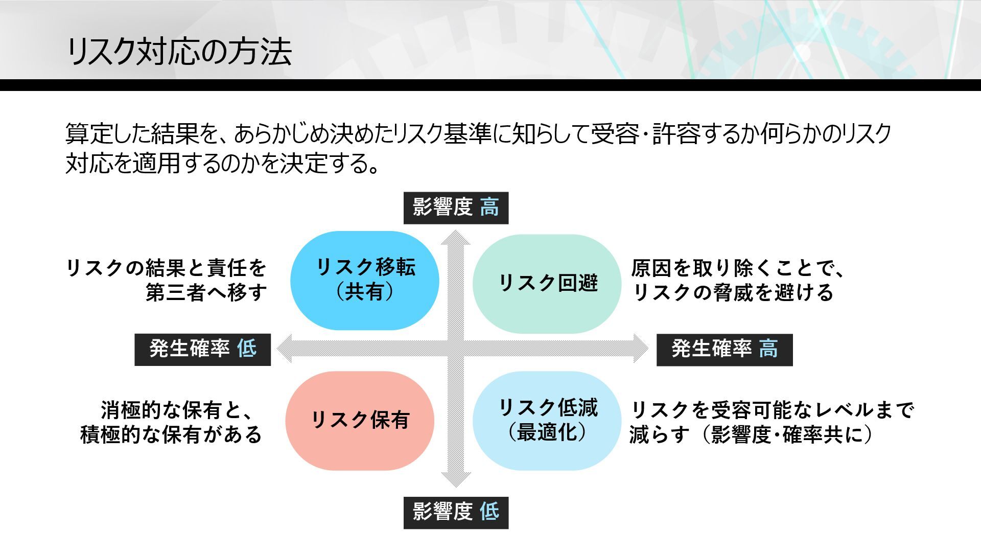 影響度 ⾼ 影響度 低 発⽣確率 低 発⽣確率 ⾼ リスク移転 (共有)