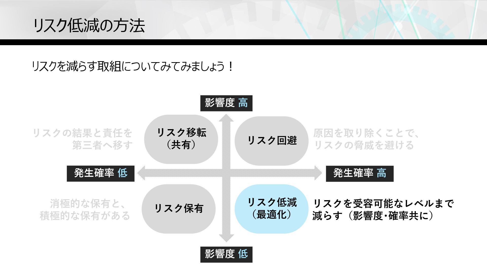 リスク回避 リスク保有 リスク低減 (最適化) 原因を取り除くことで、 リスクの脅威を避ける リスクを受容可能なレベルまで 減らす(影響度・確率共に) リスクの結果と責任を 第三者へ移す 消極的な保有と、 積極的な保有がある リスク低減の⽅法 リスクを減らす取組についてみてみましょう︕