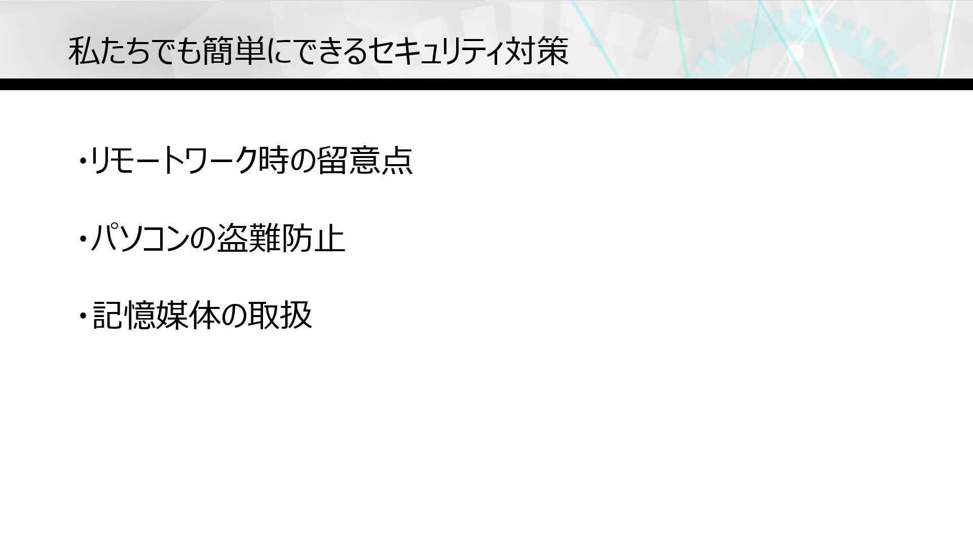 私たちでも簡単にできるセキュリティ対策 ・リモートワーク時の留意点 ・パソコンの盗難防⽌ ・記憶媒体の取扱