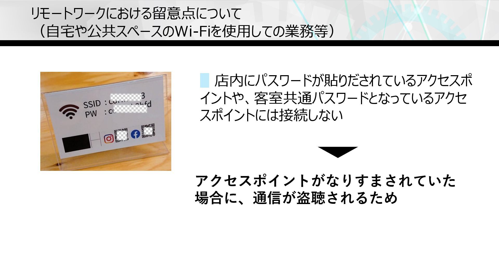 リモートワークにおける留意点について (⾃宅や公共スペースのWi-Fiを使⽤しての業務等) ▋店内にパスワードが貼りだされているアクセスポ イントや、客室共通パスワードとなっているアクセ スポイントには接続しない アクセスポイントがなりすまされていた 場合に、通信が盗聴されるため