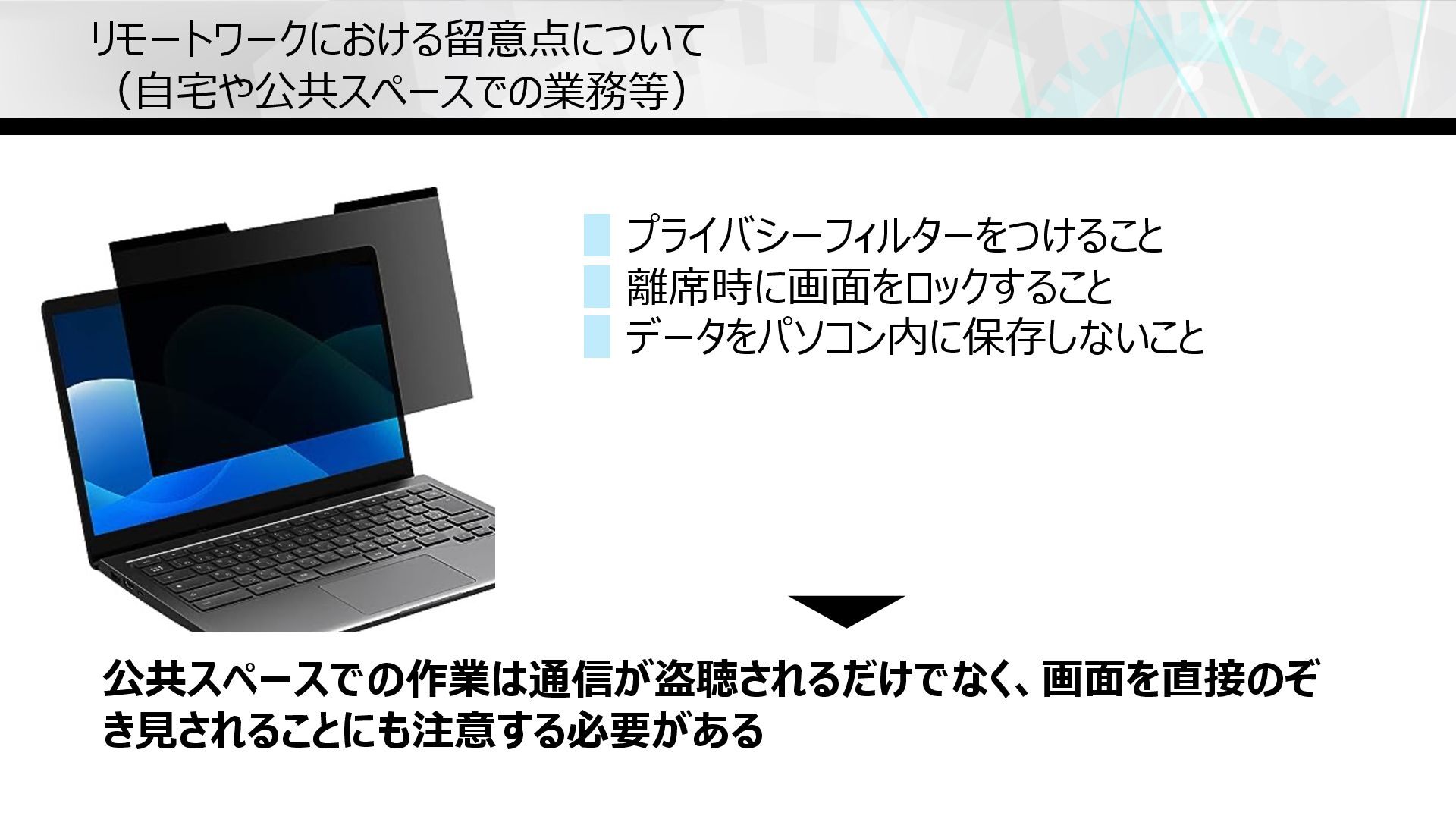 リモートワークにおける留意点について (⾃宅や公共スペースでの業務等) ▋プライバシーフィルターをつけること ▋離席時に画⾯をロックすること ▋データをパソコン内に保存しないこと 公共スペースでの作業は通信が盗聴されるだけでなく、画⾯を直接のぞ き⾒されることにも注意する必要がある