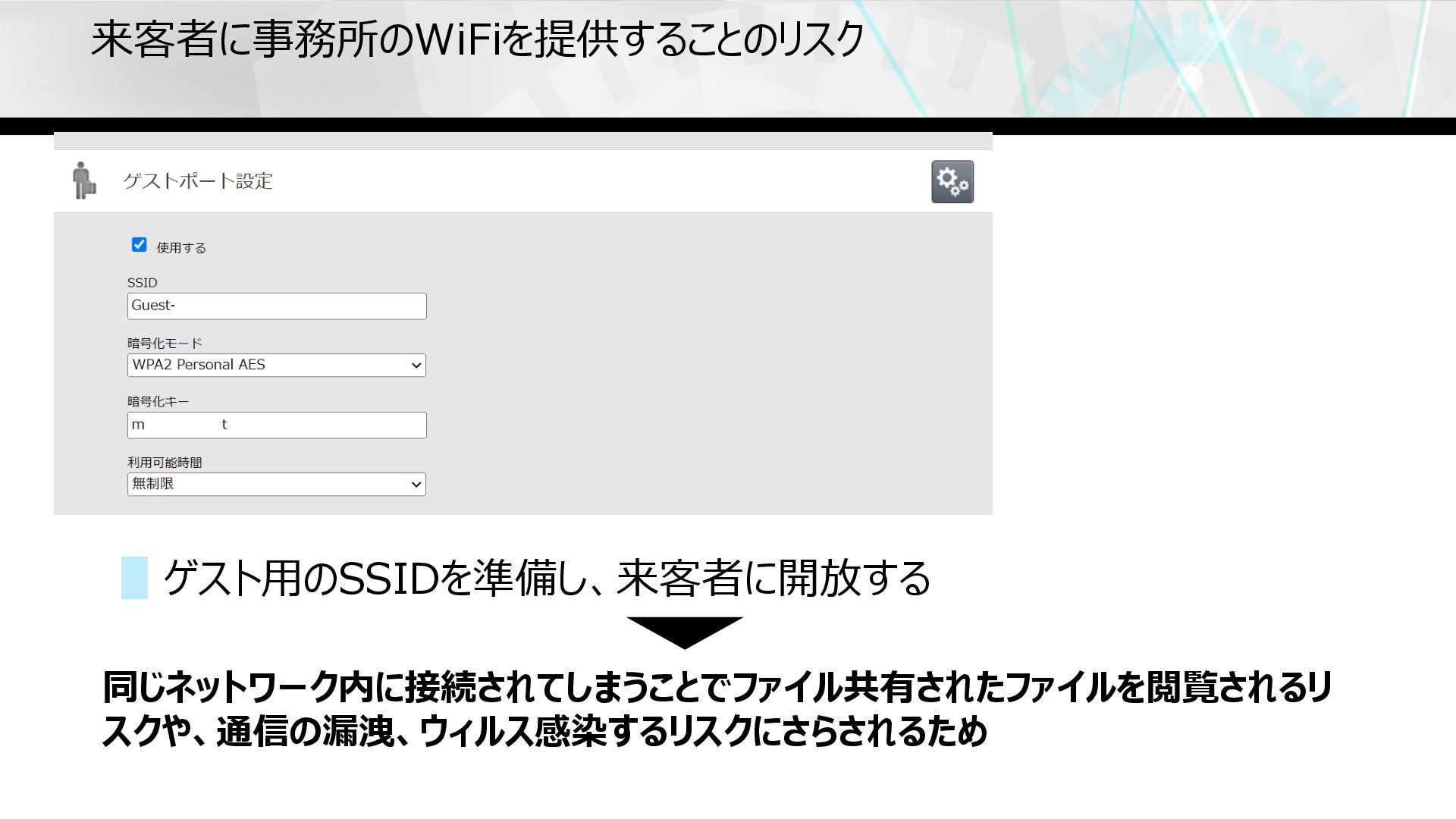 来客者に事務所のWiFiを提供することのリスク ▋ゲスト⽤のSSIDを準備し、来客者に開放する 同じネットワーク内に接続されてしまうことでファイル共有されたファイルを閲覧されるリ スクや、通信の漏洩、ウィルス感染するリスクにさらされるため