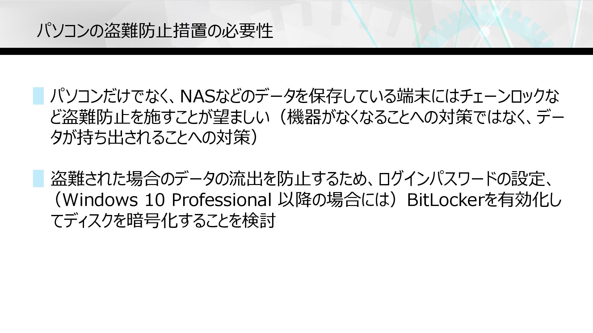 パソコンの盗難防⽌措置の必要性 ▋パソコンだけでなく、NASなどのデータを保存している端末にはチェーンロックな ど盗難防⽌を施すことが望ましい(機器がなくなることへの対策ではなく、デー タが持ち出されることへの対策) ▋盗難された場合のデータの流出を防⽌するため、ログインパスワードの設定、 (Windows 10 Professional 以降の場合には)BitLockerを有効化し てディスクを暗号化することを検討