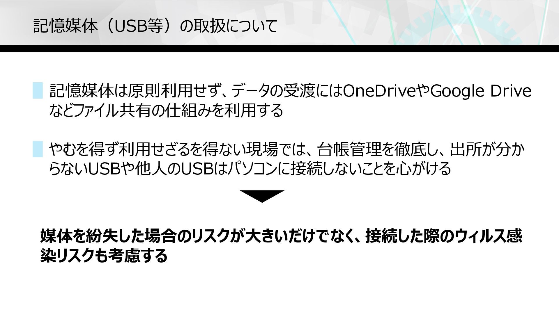 記憶媒体(USB等)の取扱について ▋記憶媒体は原則利⽤せず、データの受渡にはOneDriveやGoogle Drive などファイル共有の仕組みを利⽤する ▋やむを得ず利⽤せざるを得ない現場では、台帳管理を徹底し、出所が分か らないUSBや他⼈のUSBはパソコンに接続しないことを⼼がける 媒体を紛失した場合のリスクが⼤きいだけでなく、接続した際のウィルス感 染リスクも考慮する
