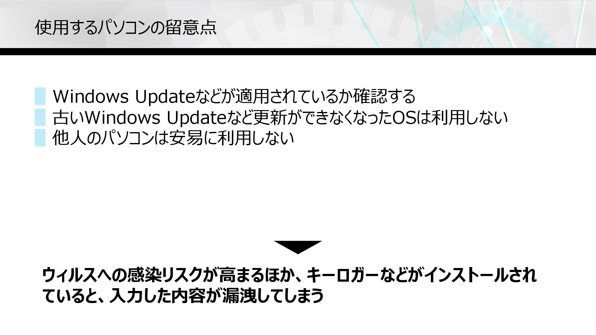 使⽤するパソコンの留意点 ▋Windows Updateなどが適⽤されているか確認する ▋古いWindows Updateなど更新ができなくなったOSは利⽤しない ▋他⼈のパソコンは安易に利⽤しない ウィルスへの感染リスクが⾼まるほか、キーロガーなどがインストールされ ていると、⼊⼒した内容が漏洩してしまう