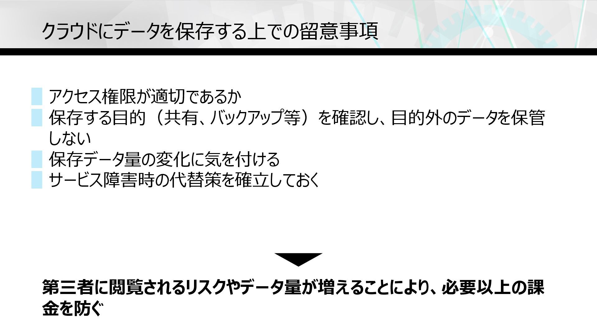 クラウドにデータを保存する上での留意事項 ▋アクセス権限が適切であるか ▋保存する⽬的(共有、バックアップ等)を確認し、⽬的外のデータを保管 しない ▋保存データ量の変化に気を付ける ▋サービス障害時の代替策を確⽴しておく 第三者に閲覧されるリスクやデータ量が増えることにより、必要以上の課 ⾦を防ぐ