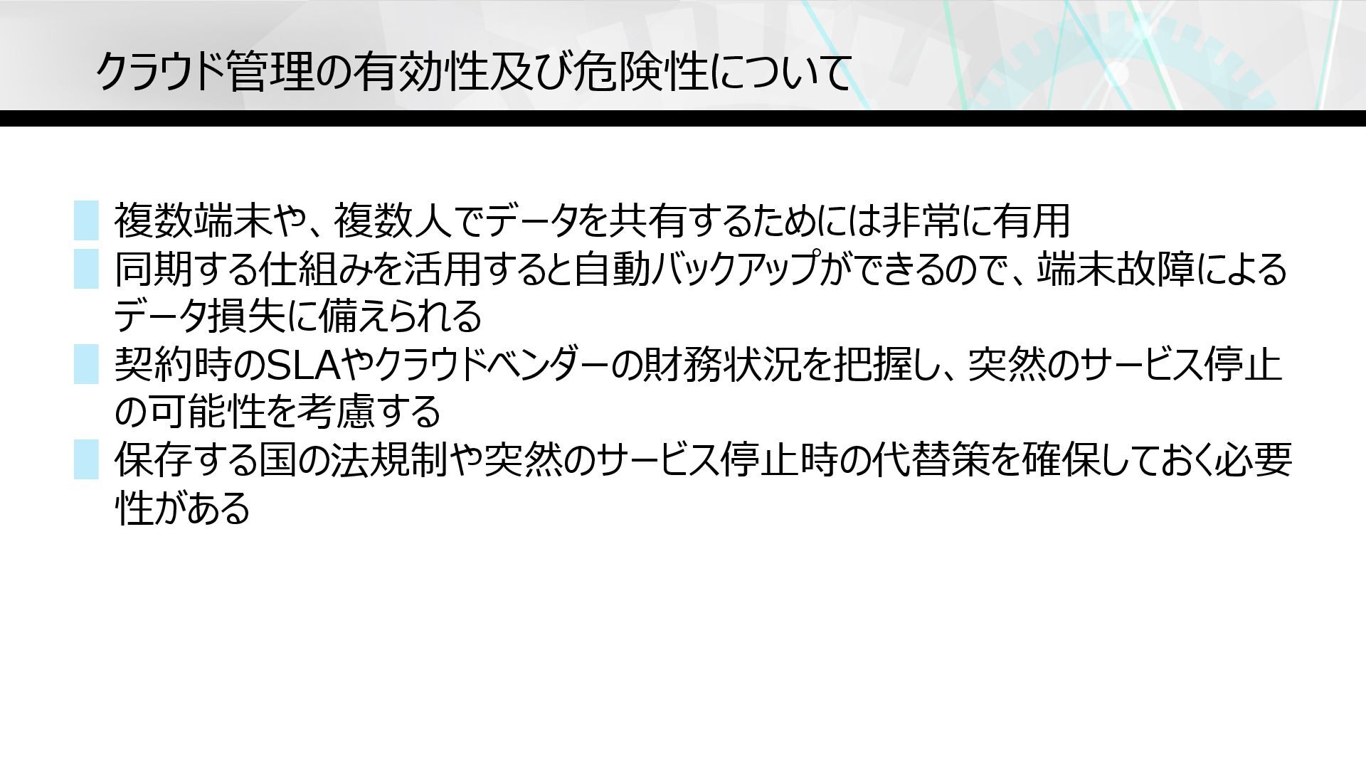 クラウド管理の有効性及び危険性について ▋複数端末や、複数⼈でデータを共有するためには⾮常に有⽤ ▋同期する仕組みを活⽤すると⾃動バックアップができるので、端末故障による データ損失に備えられる ▋契約時のSLAやクラウドベンダーの財務状況を把握し、突然のサービス停⽌ の可能性を考慮する ▋保存する国の法規制や突然のサービス停⽌時の代替策を確保しておく必要 性がある