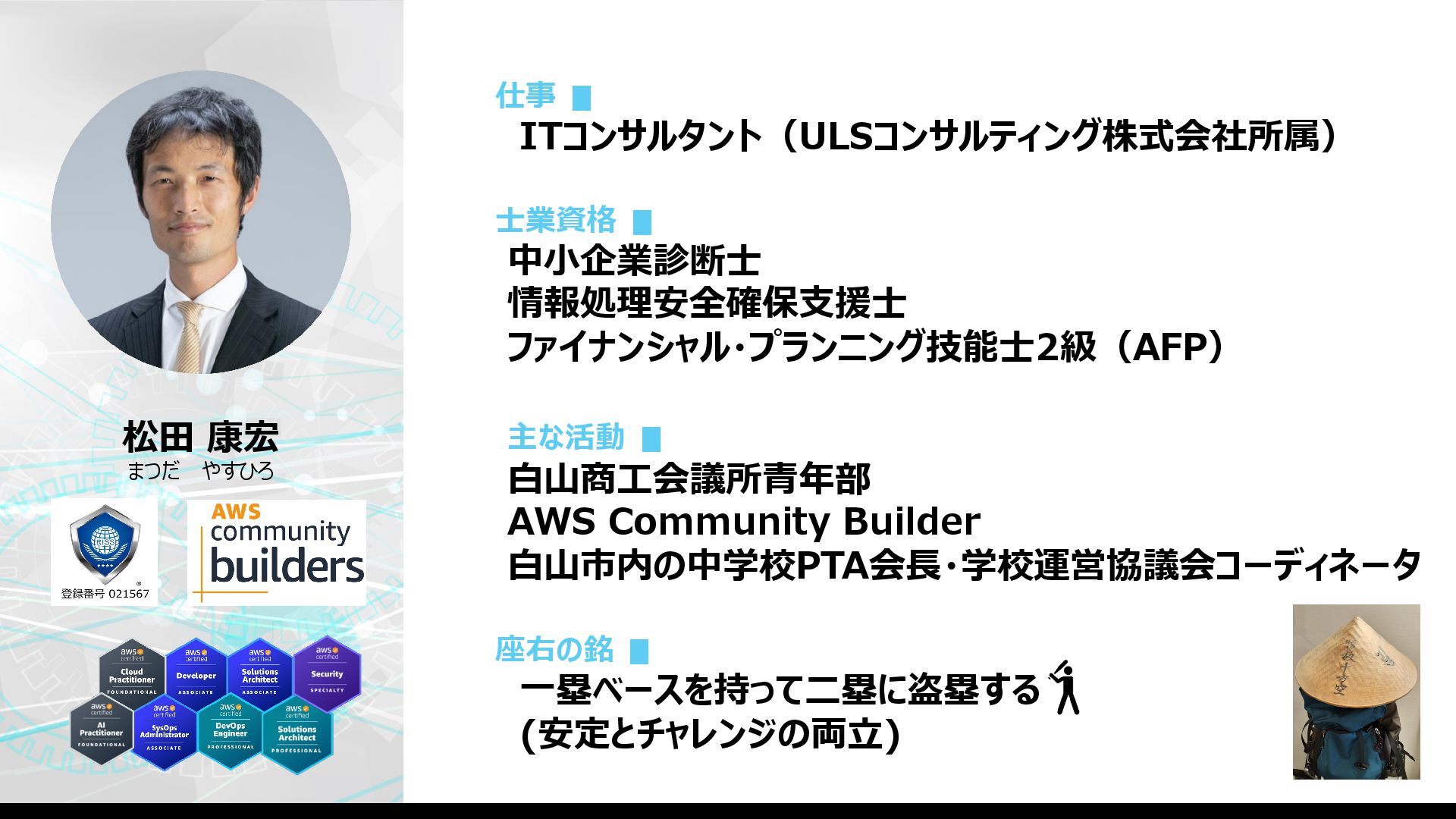 ⽩⼭商⼯会議所⻘年部 AWS Community Builder ⽩⼭市内の中学校PTA会⻑・学校運営協議会コーディネータ 座右の銘 ▮ ⼀塁ベースを持って⼆塁に盗塁する (安定とチャレンジの両⽴) 松⽥ 康宏 まつだ やすひろ