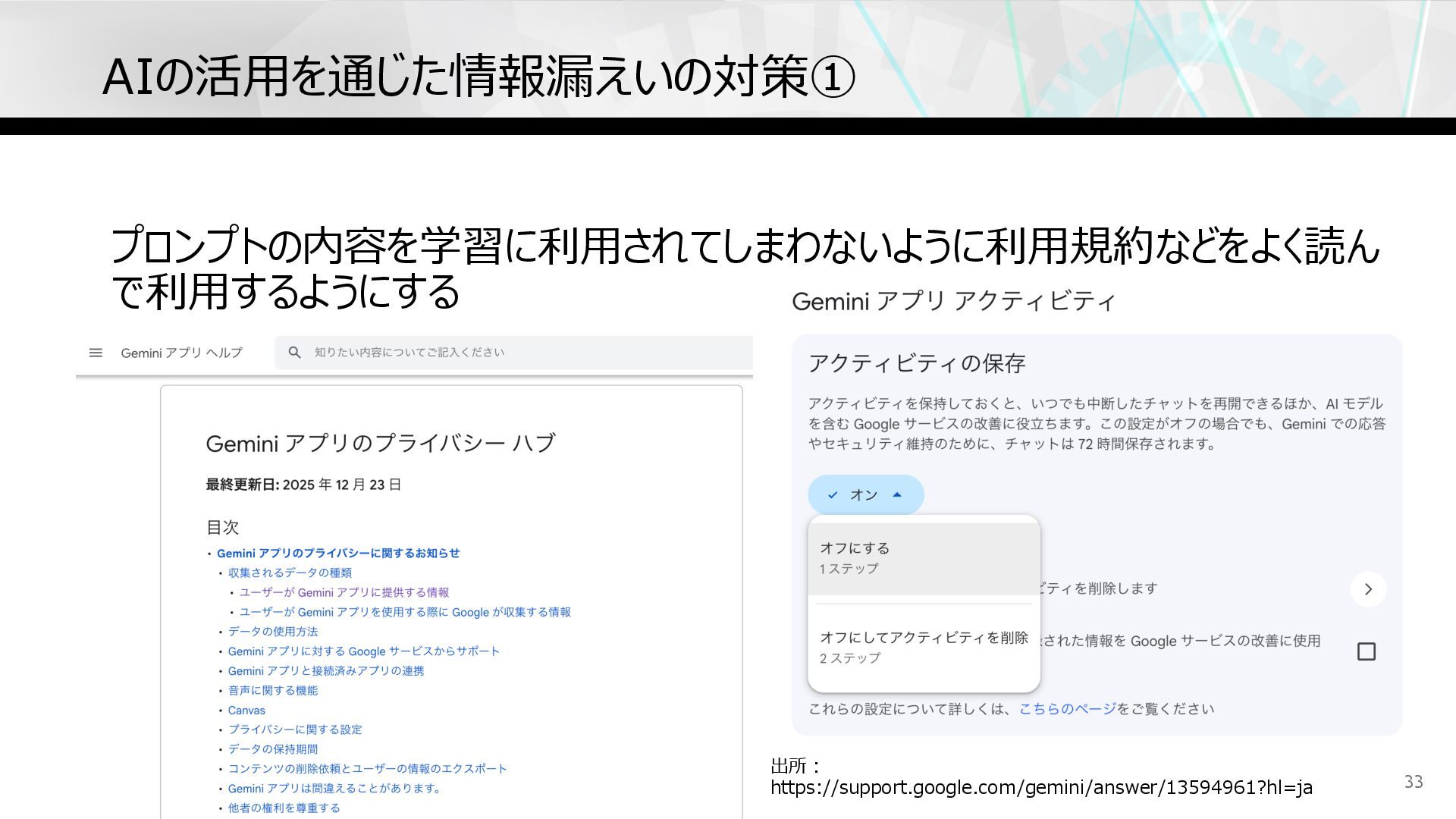 プロンプトの内容を学習に利⽤されてしまわないように利⽤規約などをよく読ん で利⽤するようにする AIの活⽤を通じた情報漏えいの対策① 33 出所︓ https://support.google.com/gemini/answer/13594961?hl=ja