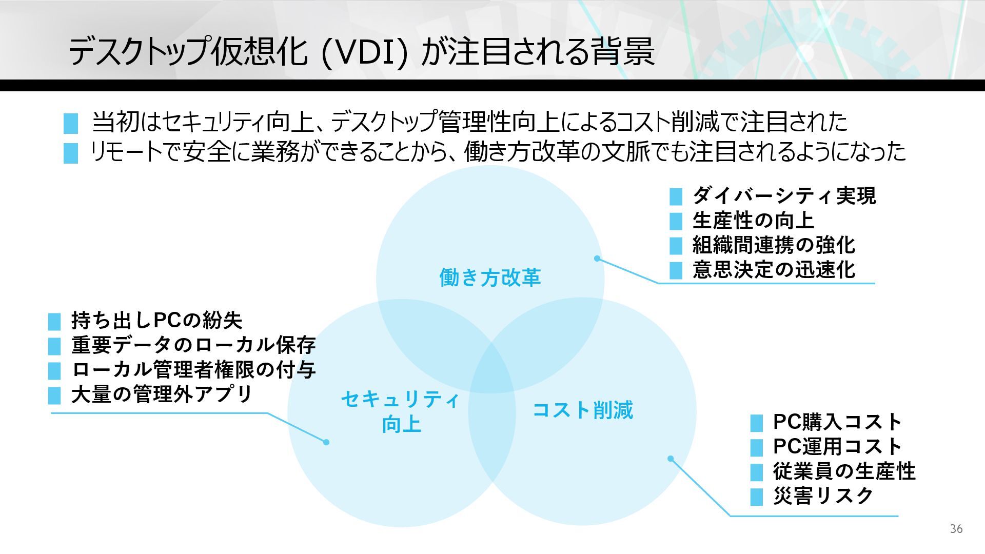 デスクトップ仮想化 (VDI) が注⽬される背景 36 ▮ 当初はセキュリティ向上、デスクトップ管理性向上によるコスト削減で注⽬された ▮ リモートで安全に業務ができることから、働き⽅改⾰の⽂脈でも注⽬されるようになった 働き⽅改⾰ コスト削減