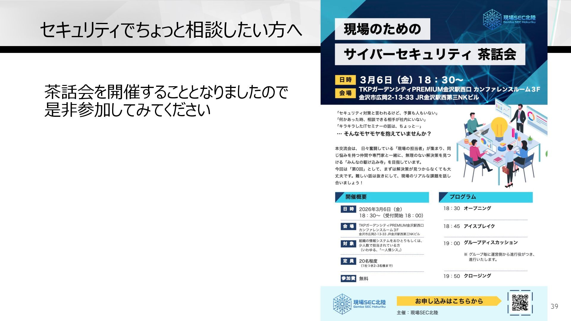 茶話会を開催することとなりましたので 是⾮参加してみてください セキュリティでちょっと相談したい⽅へ 39