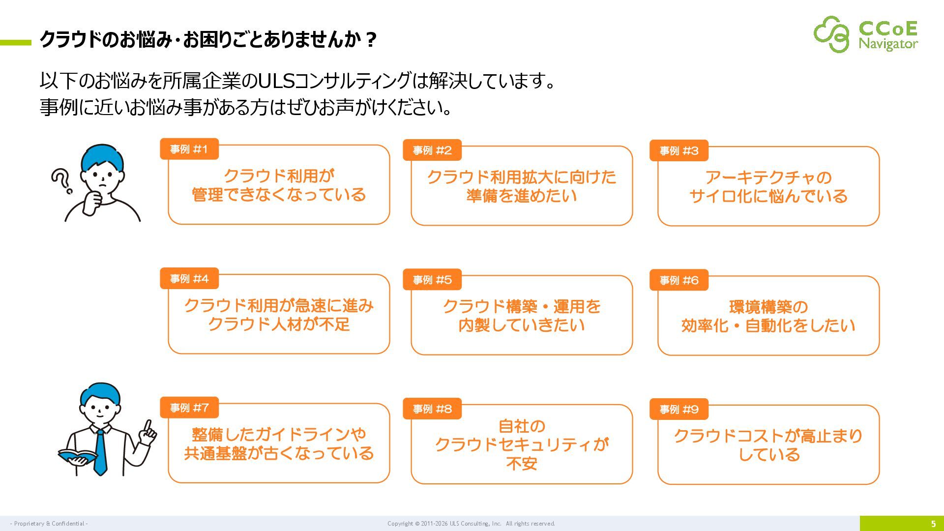 Proprietary & Confidential - 5 以下のお悩みを所属企業のULSコンサルティングは解決しています。 事例に近いお悩み事がある⽅はぜひお声がけください。 クラウドのお悩み・お困りごとありませんか︖ クラウド利用が 管理できなくなっている 事例 #1 クラウド利用拡大に向けた 準備を進めたい 事例 #2 アーキテクチャの サイロ化に悩んでいる 事例 #3 クラウド利用が急速に進み クラウド人材が不足 事例 #4 クラウド構築・運用を 内製していきたい 事例 #5 環境構築の 効率化・自動化をしたい 事例 #6 整備したガイドラインや 共通基盤が古くなっている 事例 #7 自社の クラウドセキュリティが 不安 事例 #8 クラウドコストが高止まり している 事例 #9