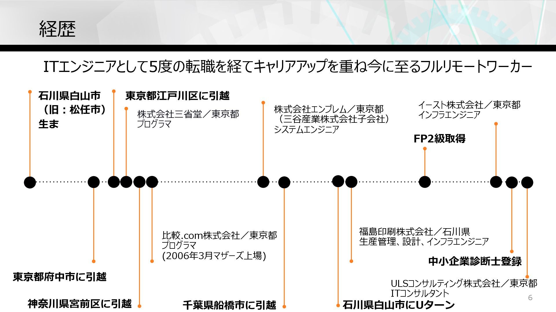 株式会社三省堂/東京都 プログラマ ⽯川県⽩⼭市 (旧︓松任市) ⽣ま 東京都江⼾川区に引越 ⽯川県⽩⼭市にUターン 千葉県船橋市に引越 中⼩企業診断⼠登録 FP2級取得 イースト株式会社/東京都 インフラエンジニア ULSコンサルティング株式会社/東京都 ITコンサルタント 6 東京都府中市に引越 ITエンジニアとして5度の転職を経てキャリアアップを重ね今に⾄るフルリモートワーカー
