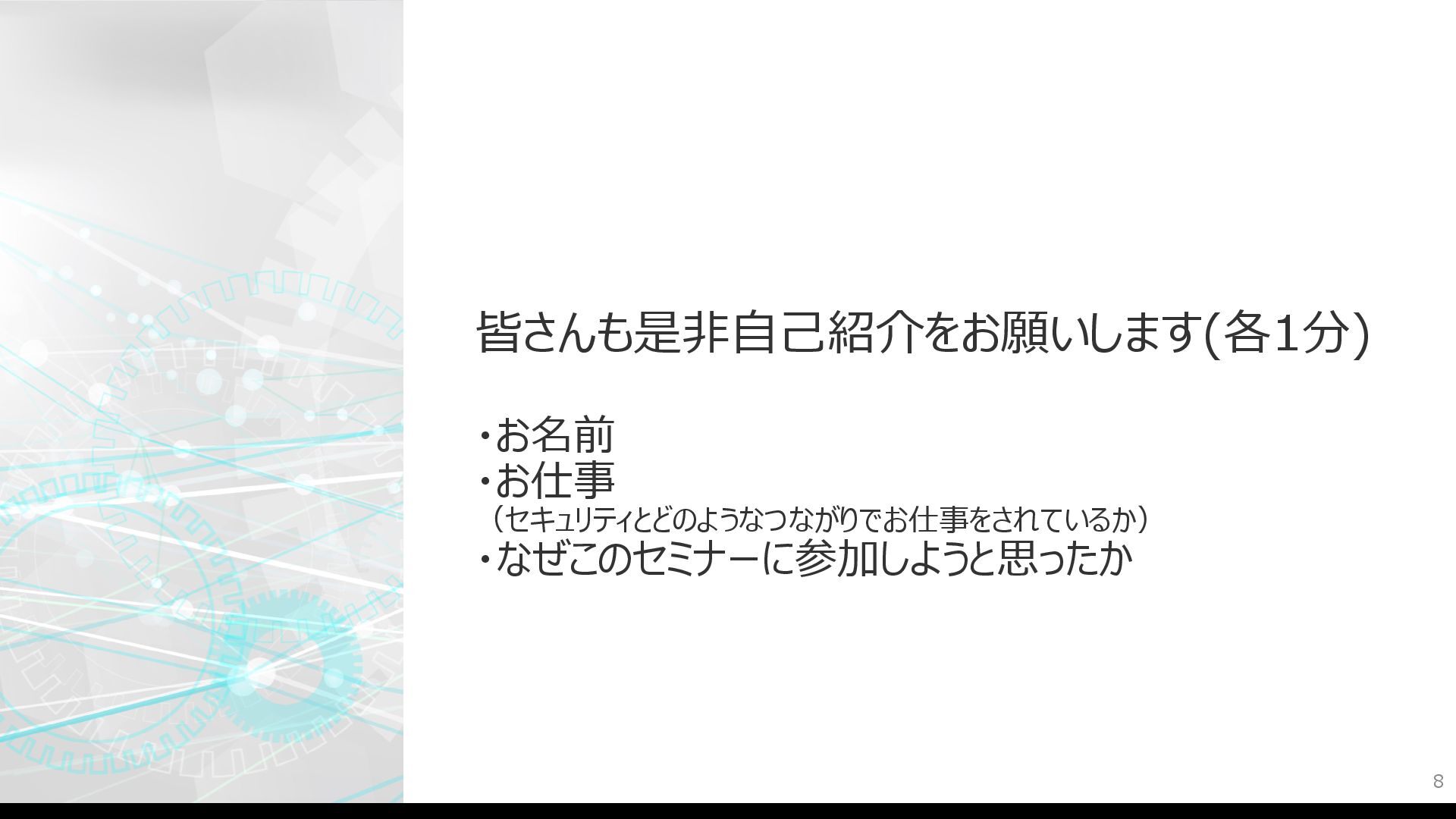皆さんも是⾮⾃⼰紹介をお願いします(各1分) ・お名前 ・お仕事 (セキュリティとどのようなつながりでお仕事をされているか) ・なぜこのセミナーに参加しようと思ったか 8