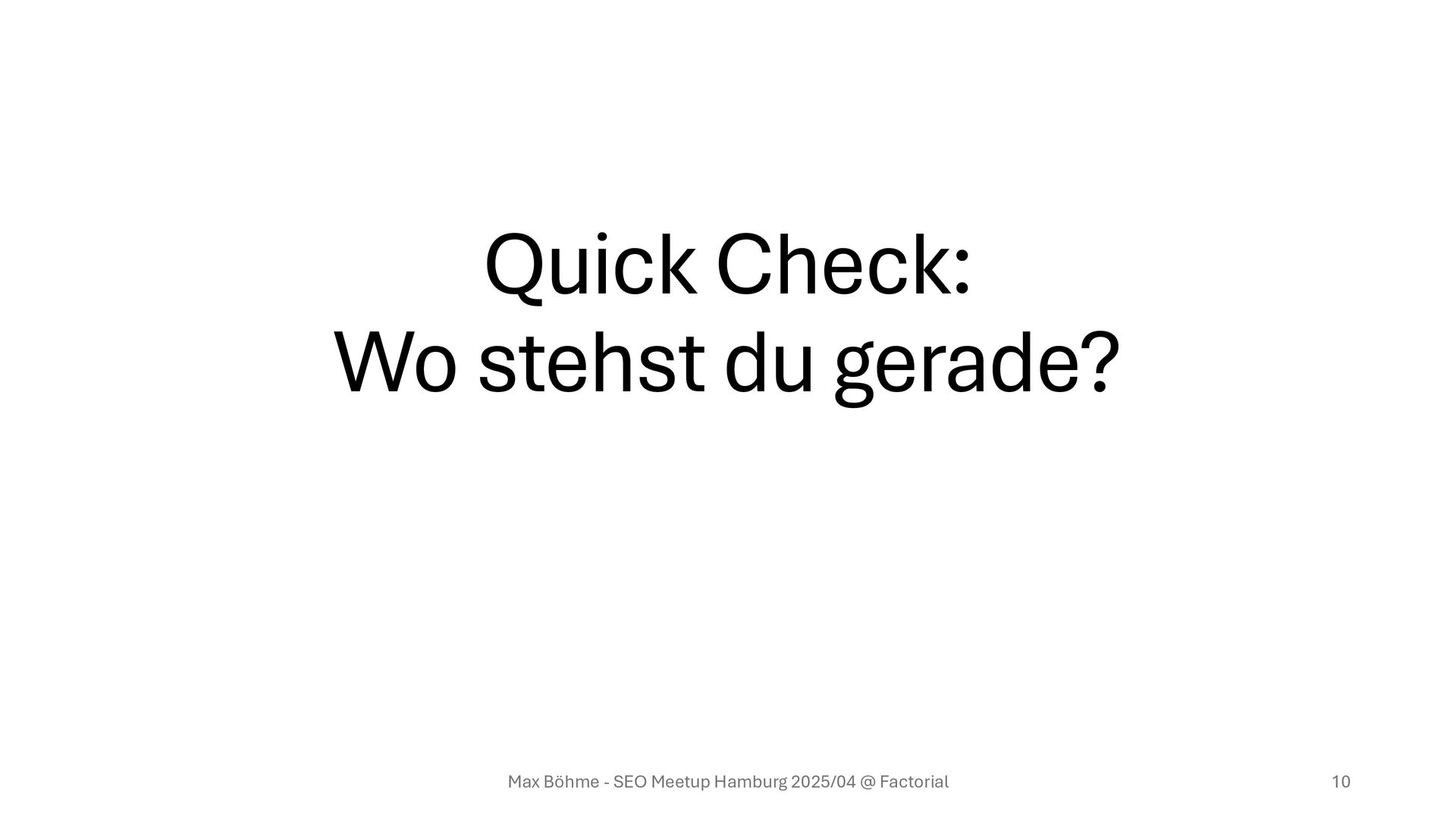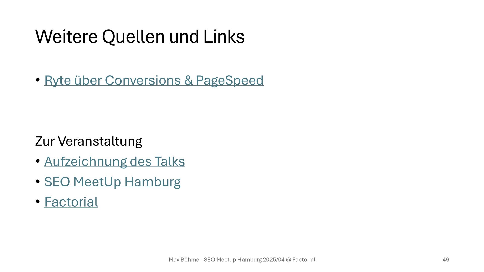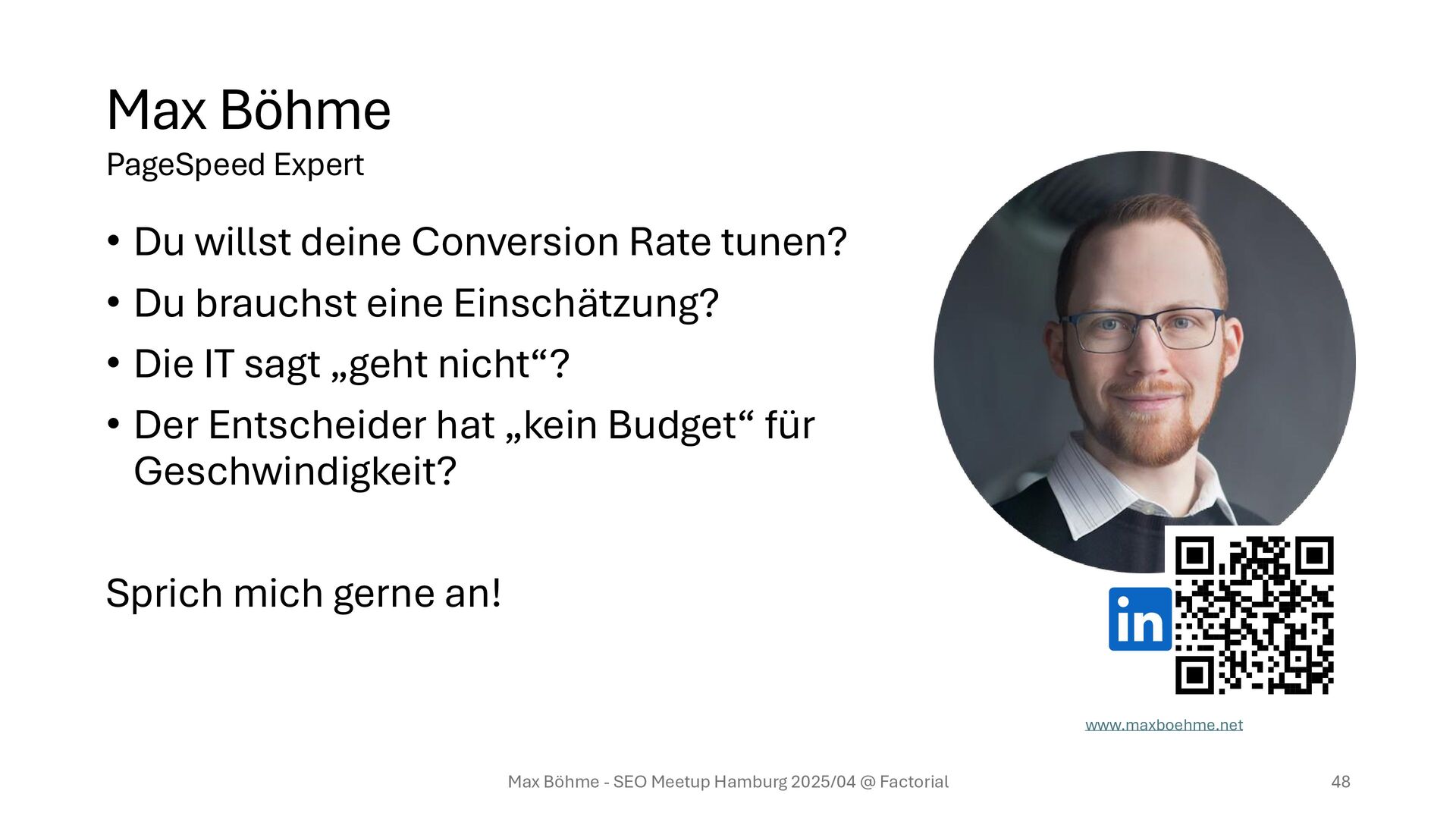 eine Einschätzung? • Die IT sagt „geht nicht“? • Der Entscheider hat „kein Budget“ für Geschwindigkeit? Sprich mich gerne an! Max Böhme - SEO Meetup Hamburg 2025/04 @ Factorial 48 Max Böhme PageSpeed Expert www.maxboehme.net