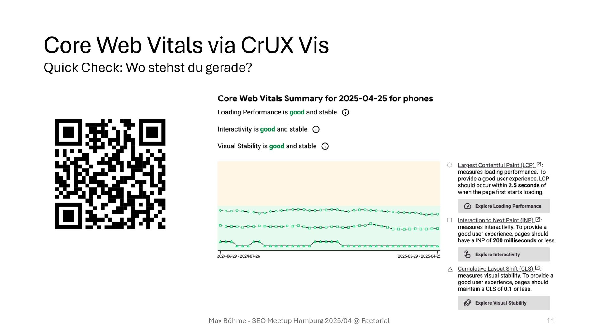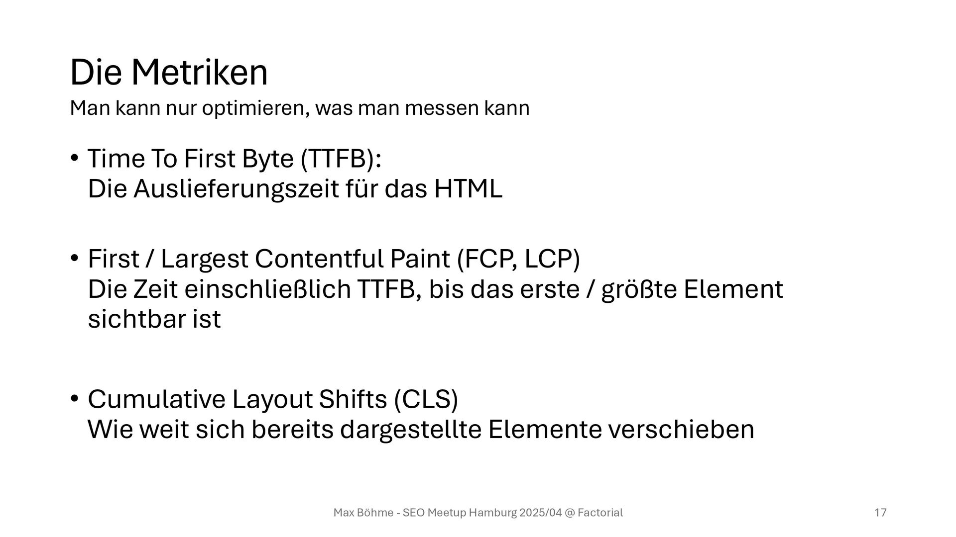 für das HTML • First / Largest Contentful Paint (FCP, LCP) Die Zeit einschließlich TTFB, bis das erste / größte Element sichtbar ist • Cumulative Layout Shifts (CLS) Wie weit sich bereits dargestellte Elemente verschieben Max Böhme - SEO Meetup Hamburg 2025/04 @ Factorial 17 Man kann nur optimieren, was man messen kann