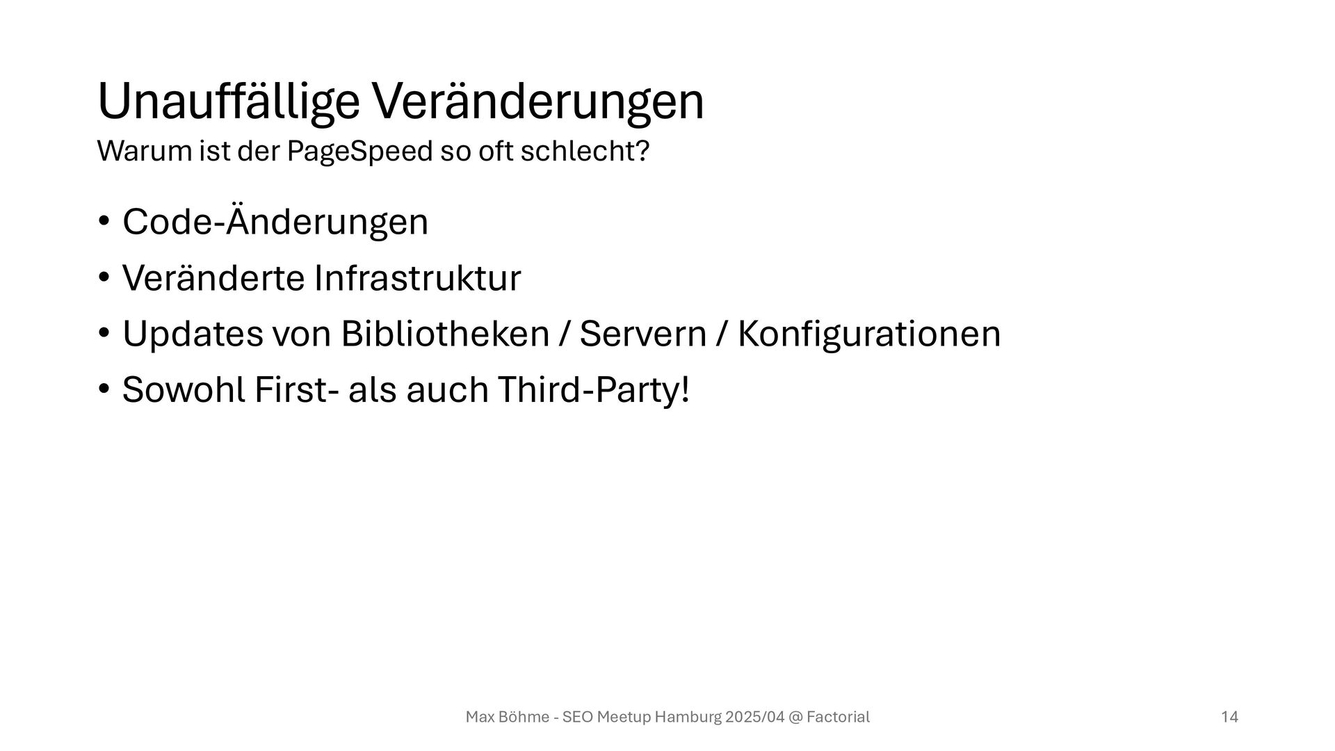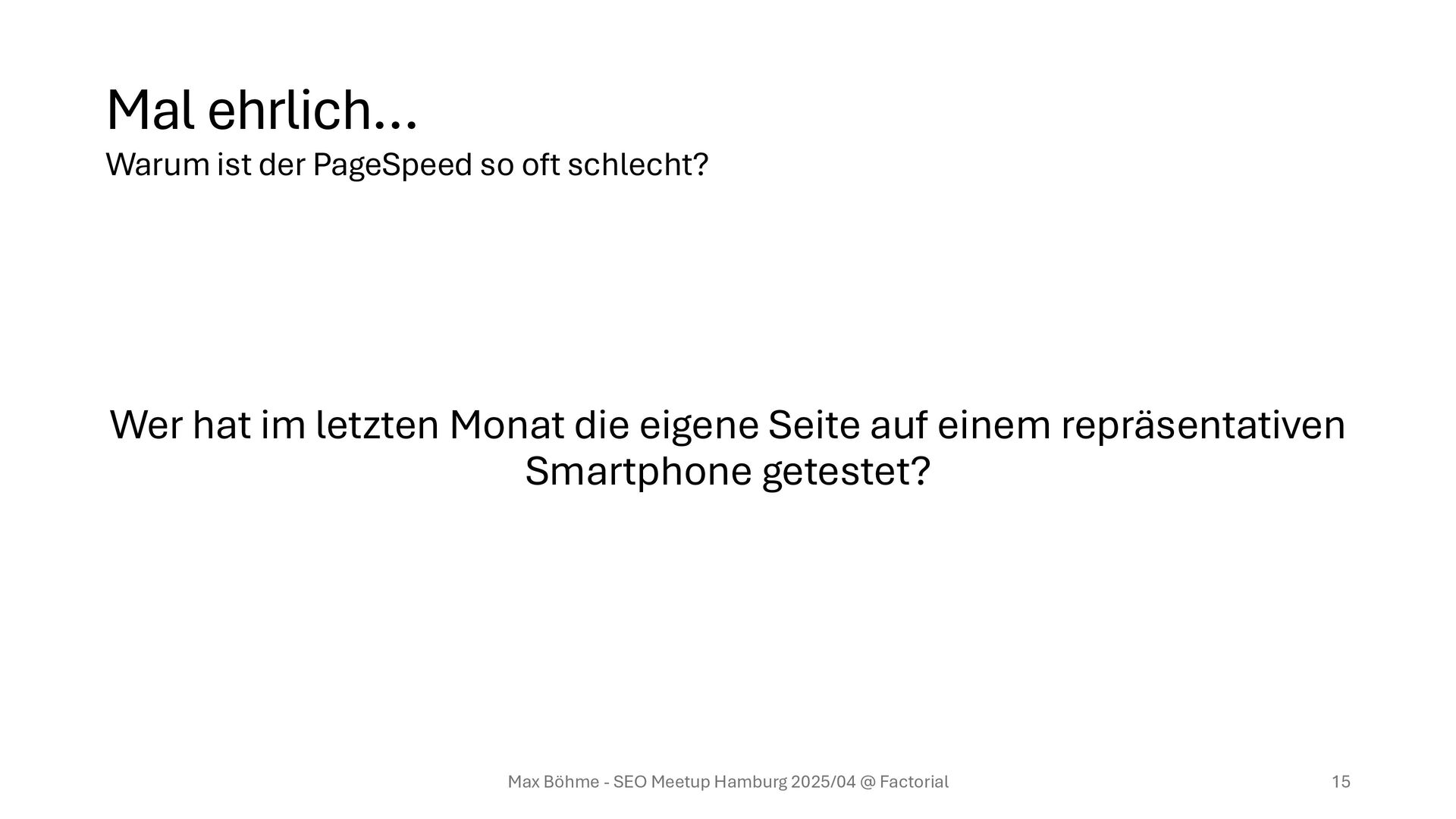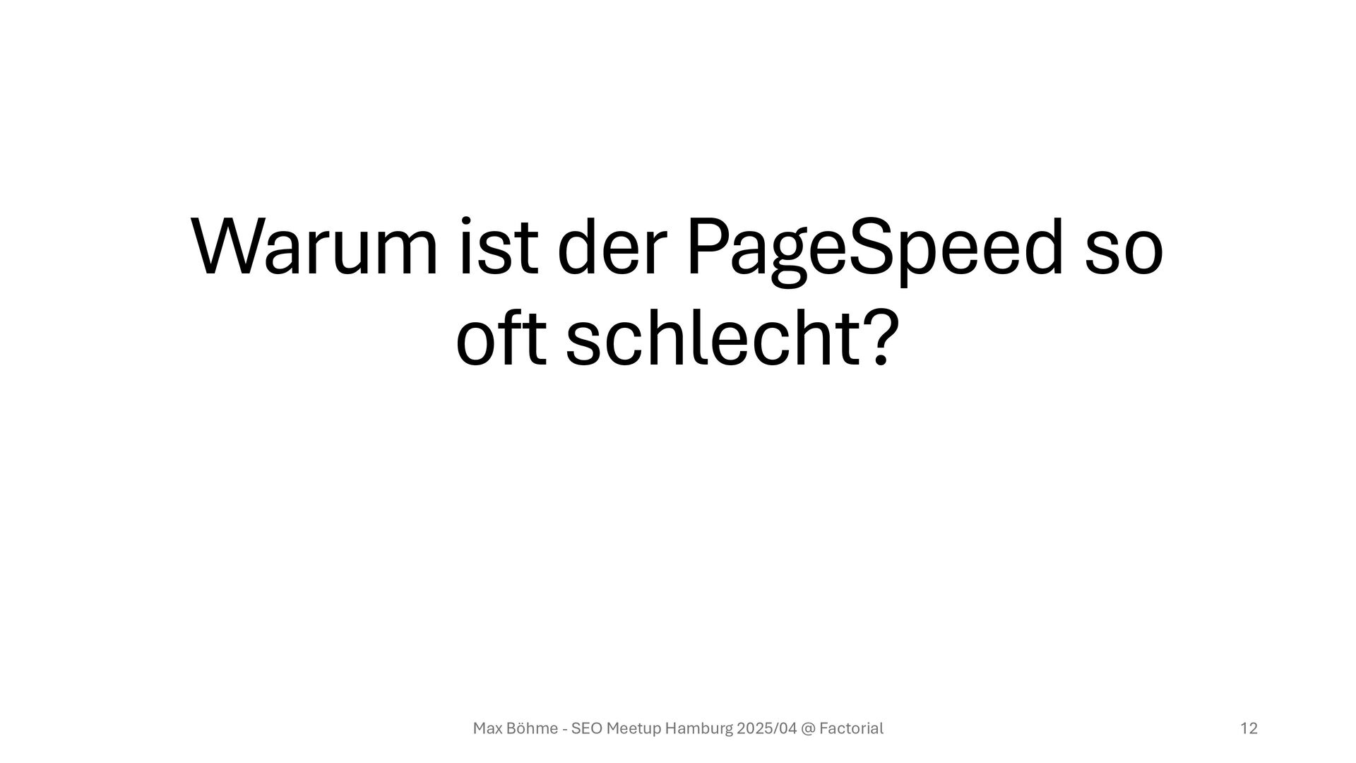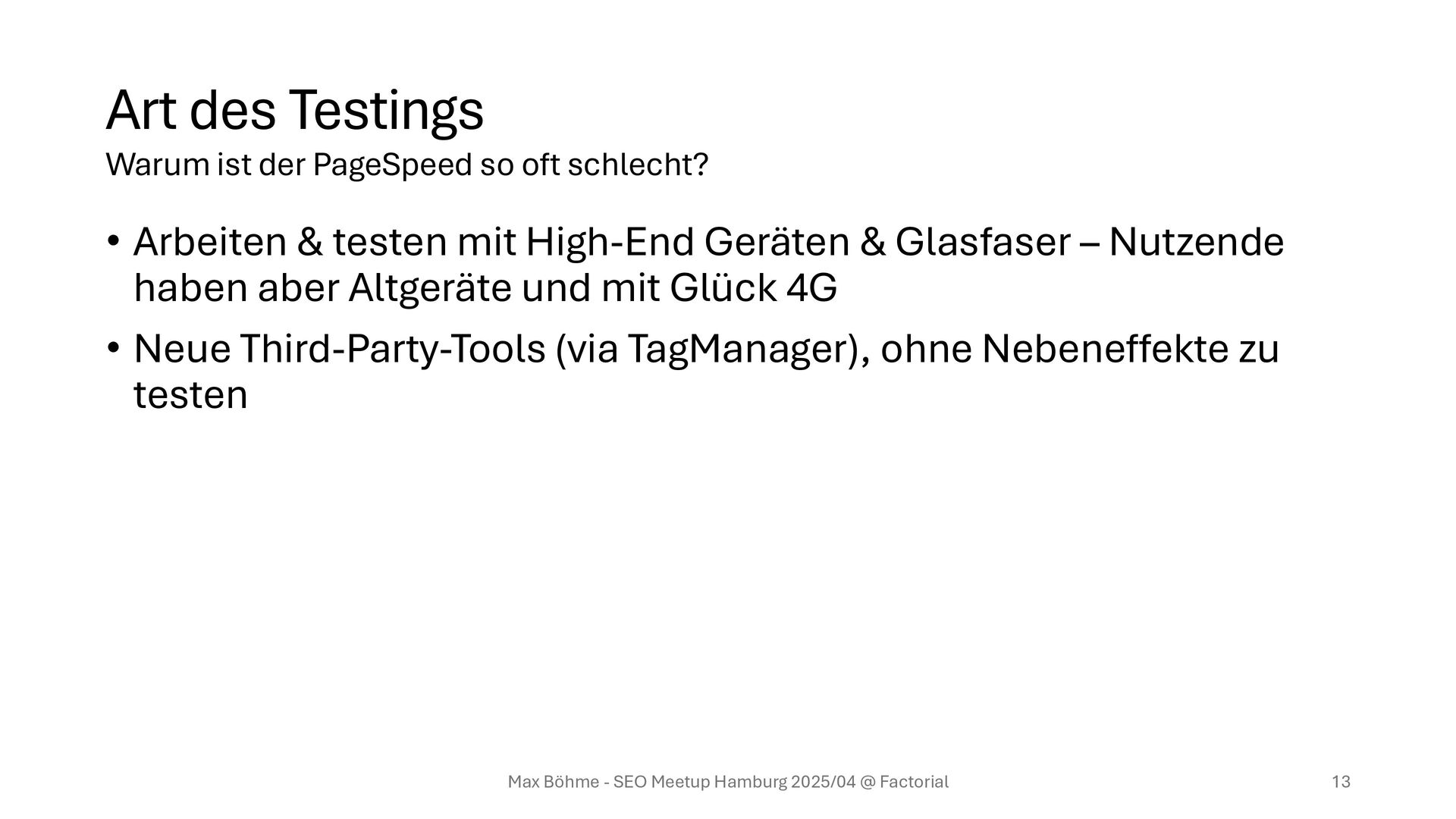 & Glasfaser – Nutzende haben aber Altgeräte und mit Glück 4G • Neue Third-Party-Tools (via TagManager), ohne Nebeneffekte zu testen Max Böhme - SEO Meetup Hamburg 2025/04 @ Factorial 13 Warum ist der PageSpeed so oft schlecht?