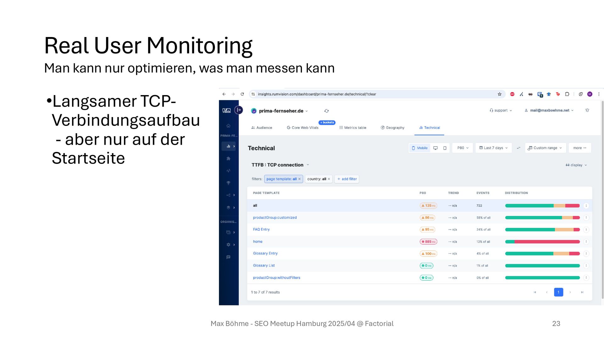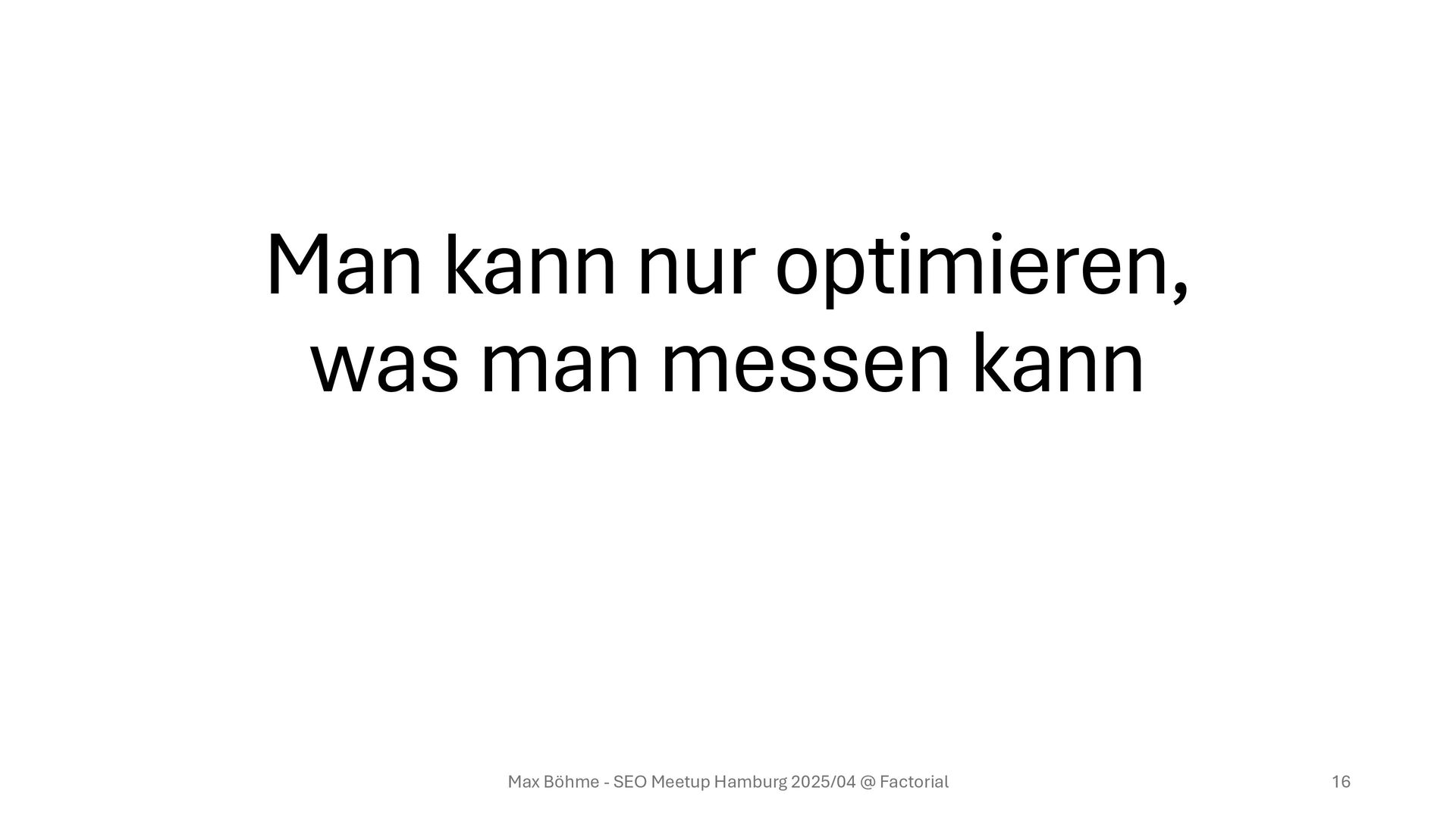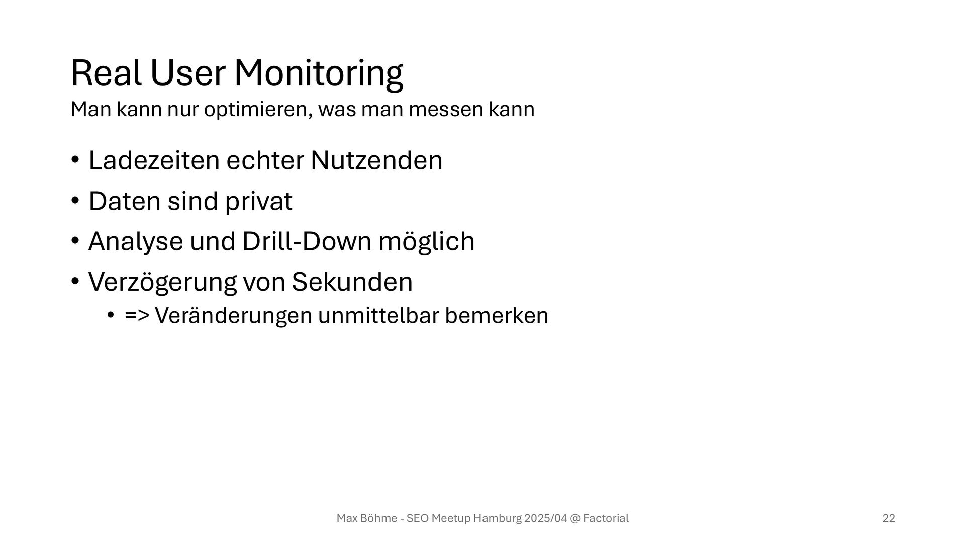 privat • Analyse und Drill-Down möglich • Verzögerung von Sekunden • => Veränderungen unmittelbar bemerken Max Böhme - SEO Meetup Hamburg 2025/04 @ Factorial 22 Man kann nur optimieren, was man messen kann