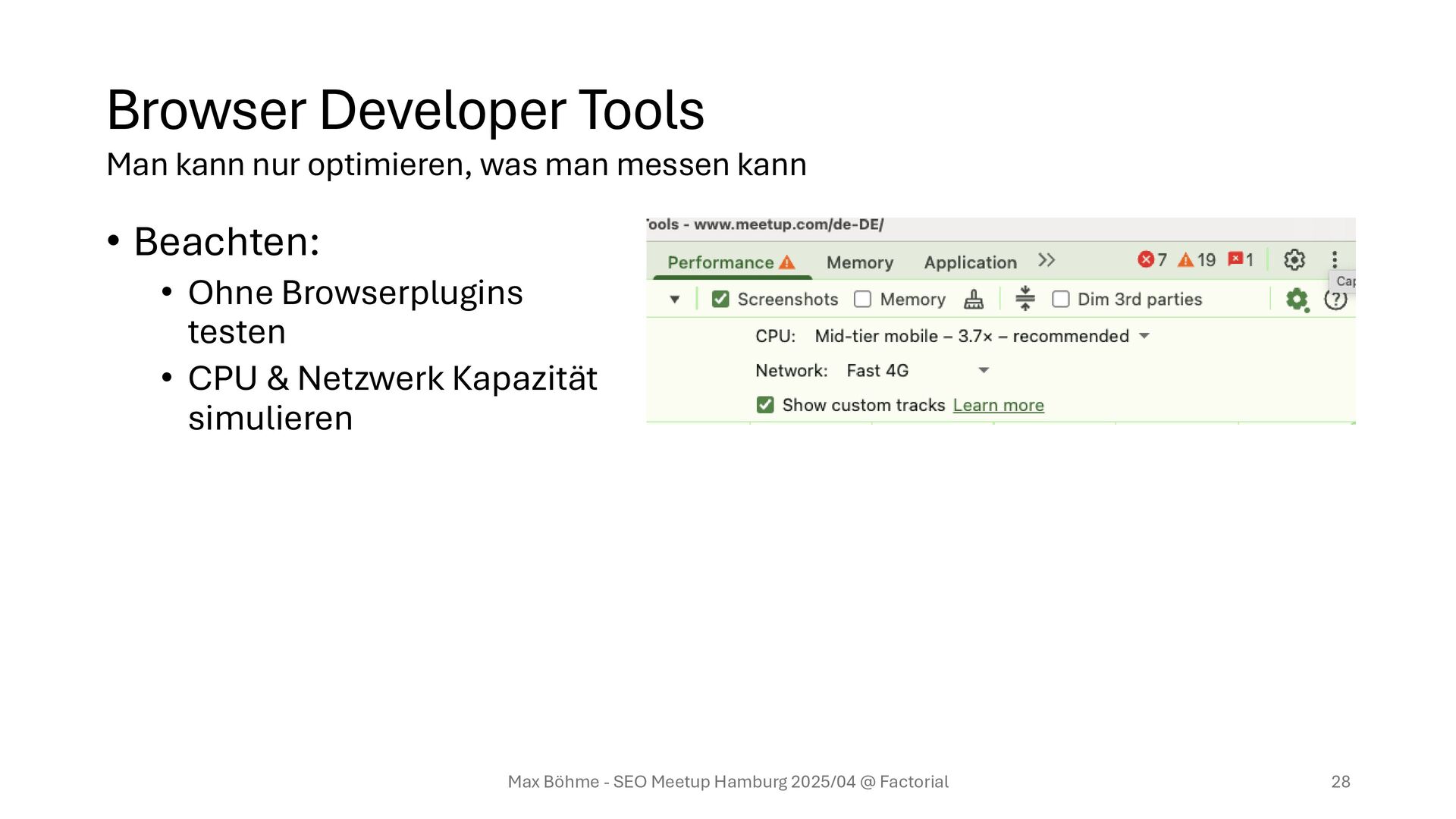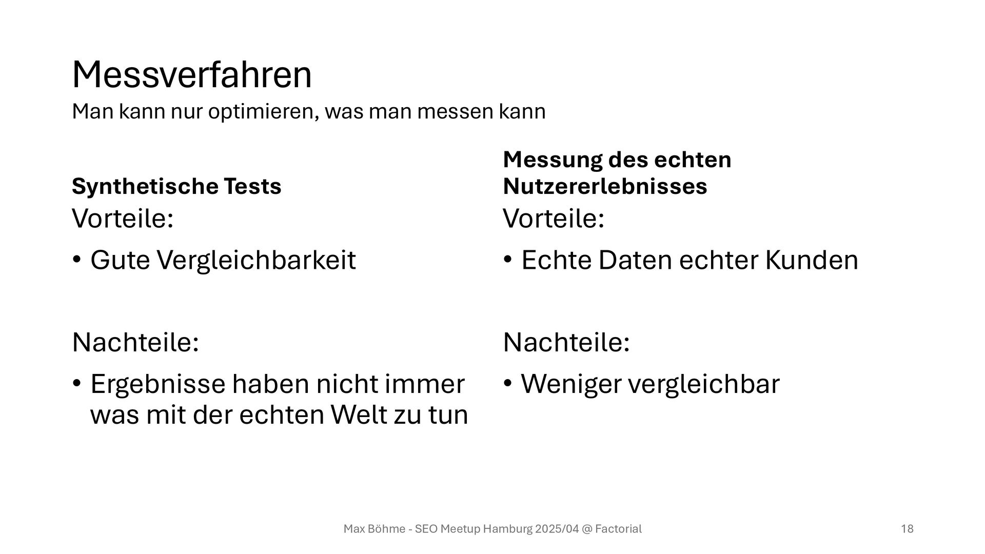 nicht immer was mit der echten Welt zu tun Messung des echten Nutzererlebnisses Vorteile: • Echte Daten echter Kunden Nachteile: • Weniger vergleichbar Max Böhme - SEO Meetup Hamburg 2025/04 @ Factorial 18 Messverfahren Man kann nur optimieren, was man messen kann