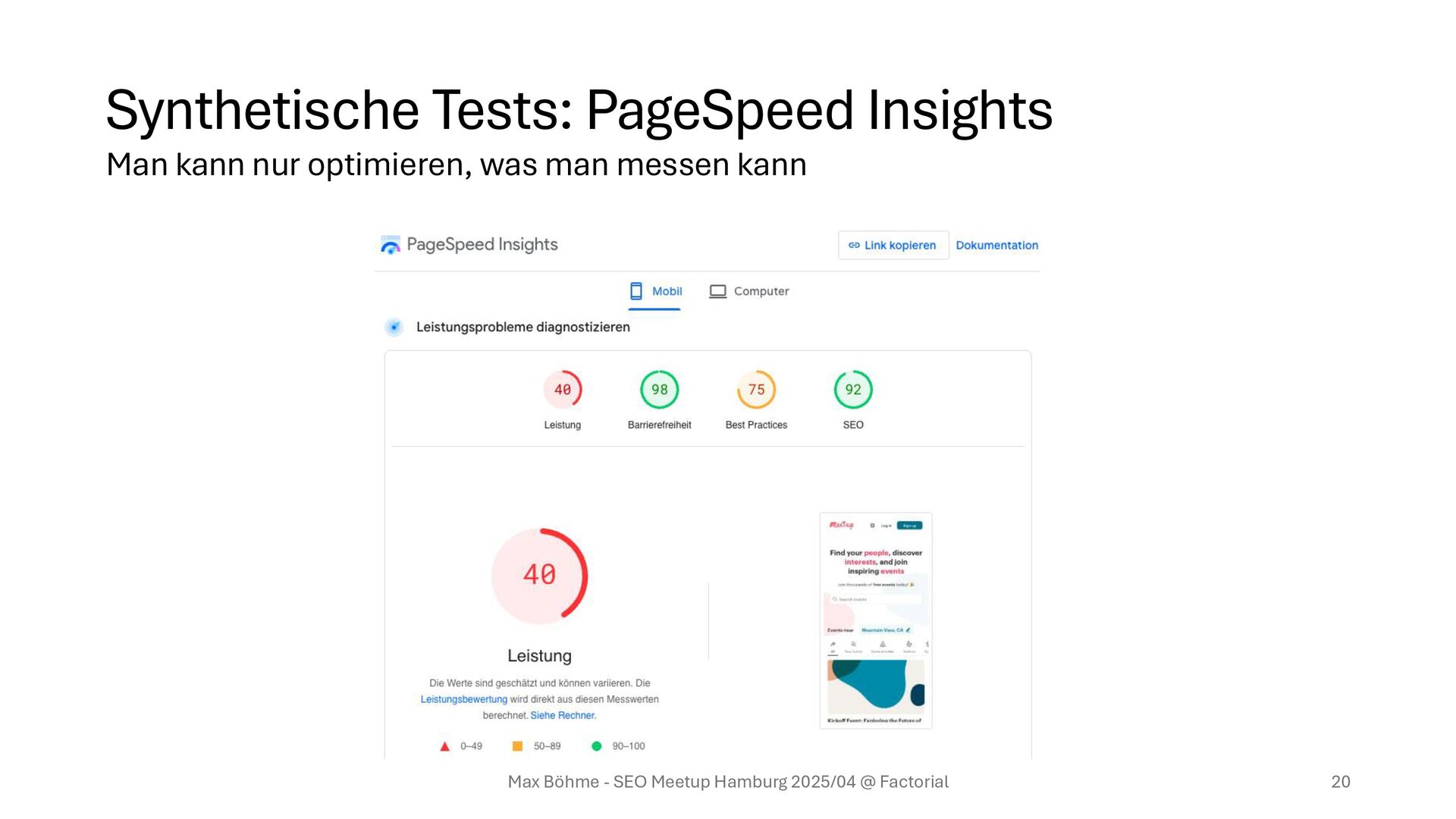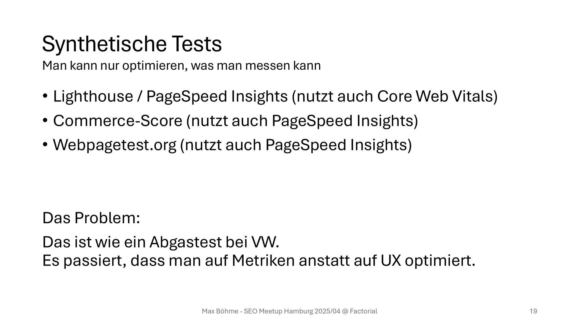 Web Vitals) • Commerce-Score (nutzt auch PageSpeed Insights) • Webpagetest.org (nutzt auch PageSpeed Insights) Das Problem: Das ist wie ein Abgastest bei VW. Es passiert, dass man auf Metriken anstatt auf UX optimiert. Max Böhme - SEO Meetup Hamburg 2025/04 @ Factorial 19 Man kann nur optimieren, was man messen kann