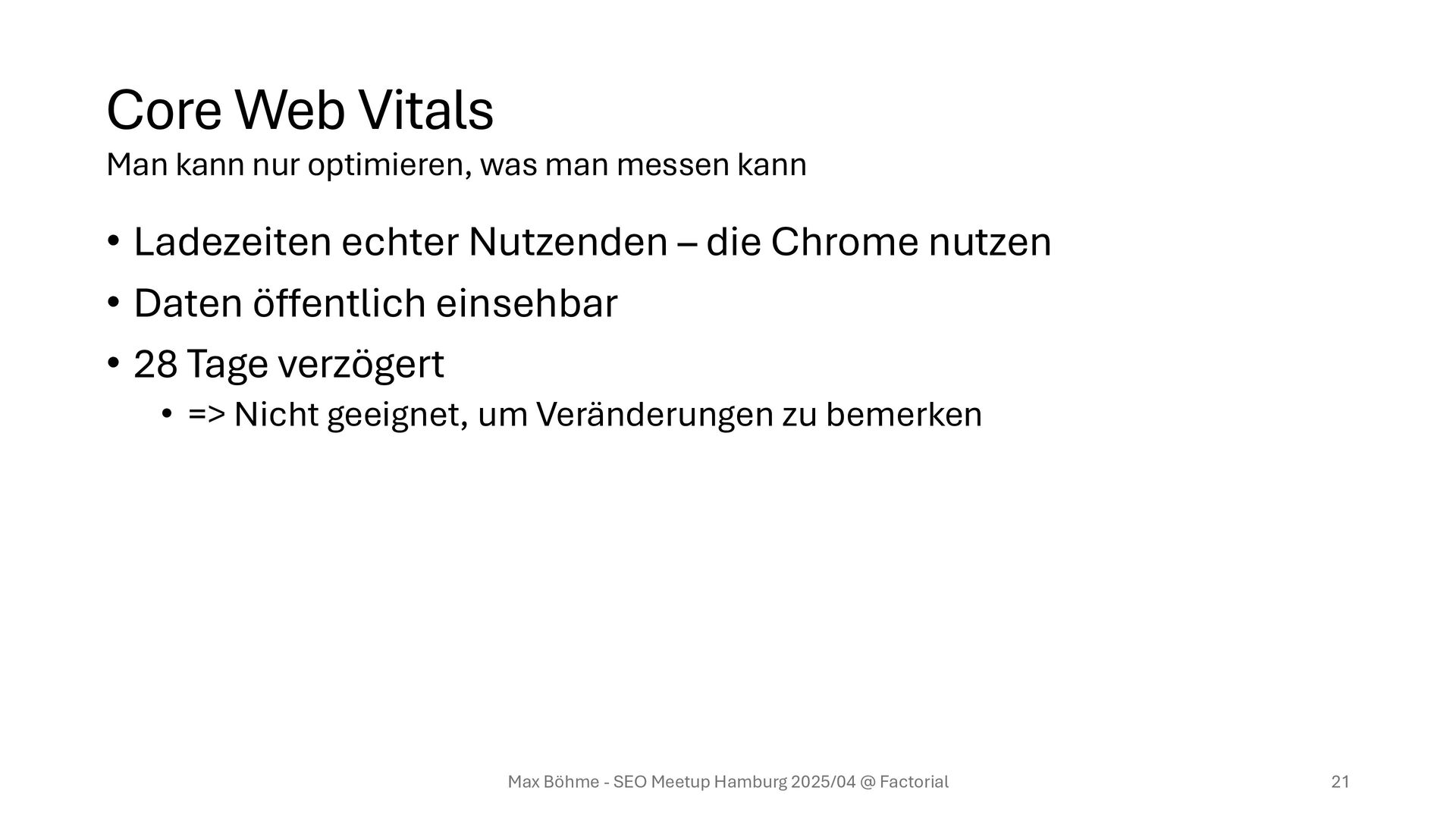 nutzen • Daten öffentlich einsehbar • 28 Tage verzögert • => Nicht geeignet, um Veränderungen zu bemerken Max Böhme - SEO Meetup Hamburg 2025/04 @ Factorial 21 Man kann nur optimieren, was man messen kann