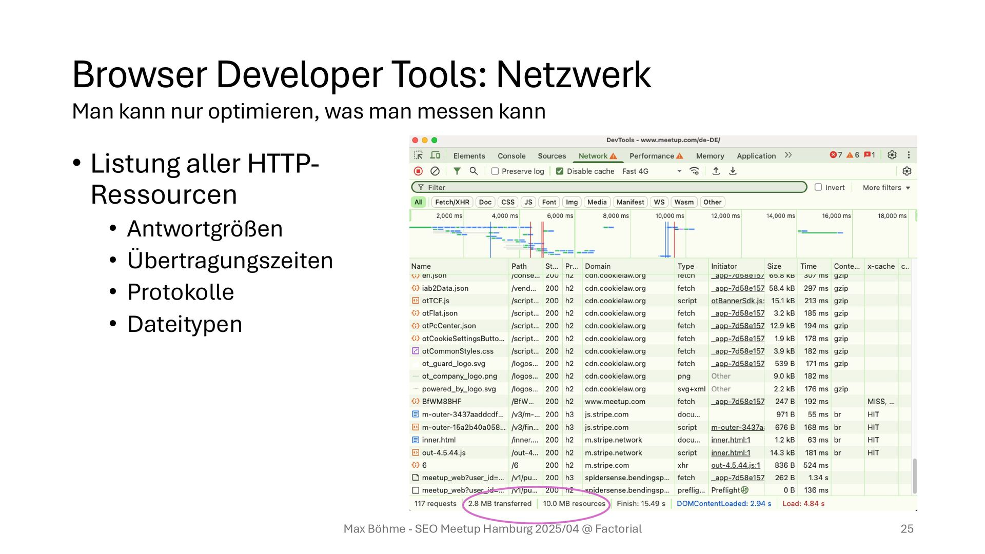 Antwortgrößen • Übertragungszeiten • Protokolle • Dateitypen Max Böhme - SEO Meetup Hamburg 2025/04 @ Factorial 25 Man kann nur optimieren, was man messen kann