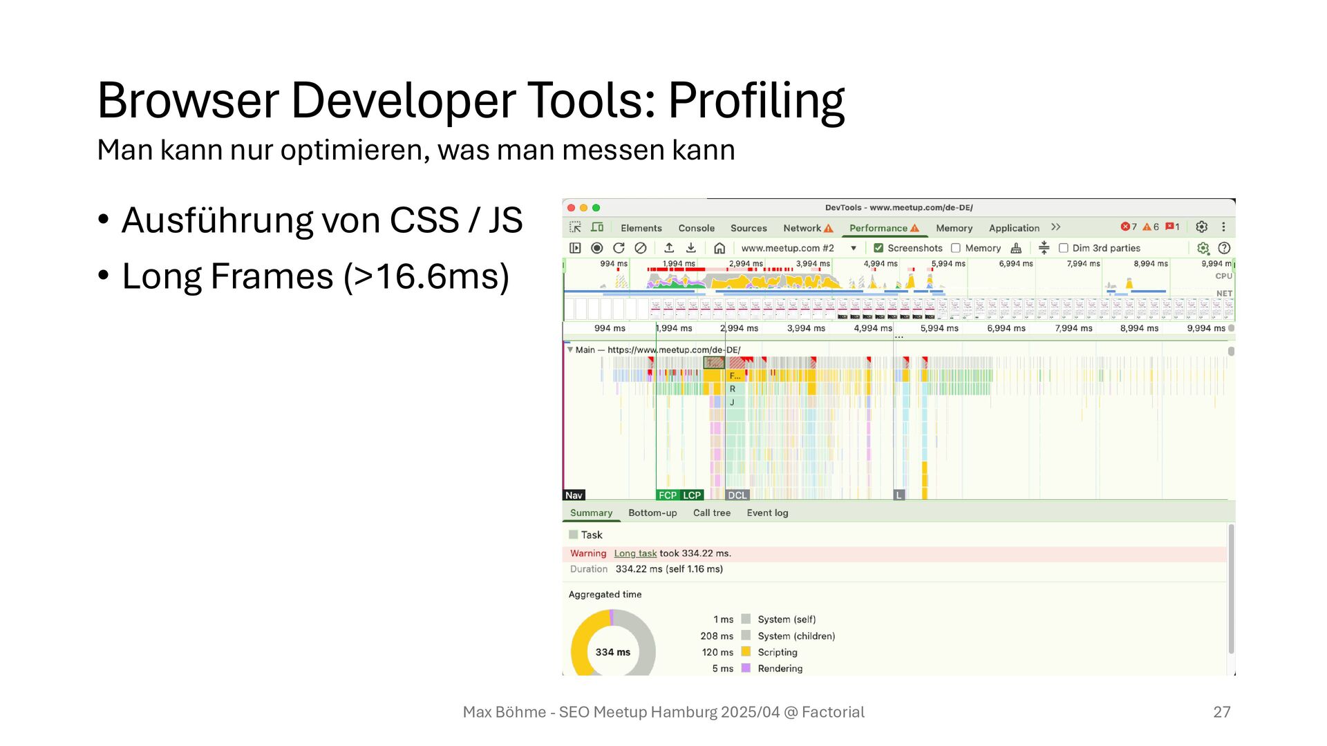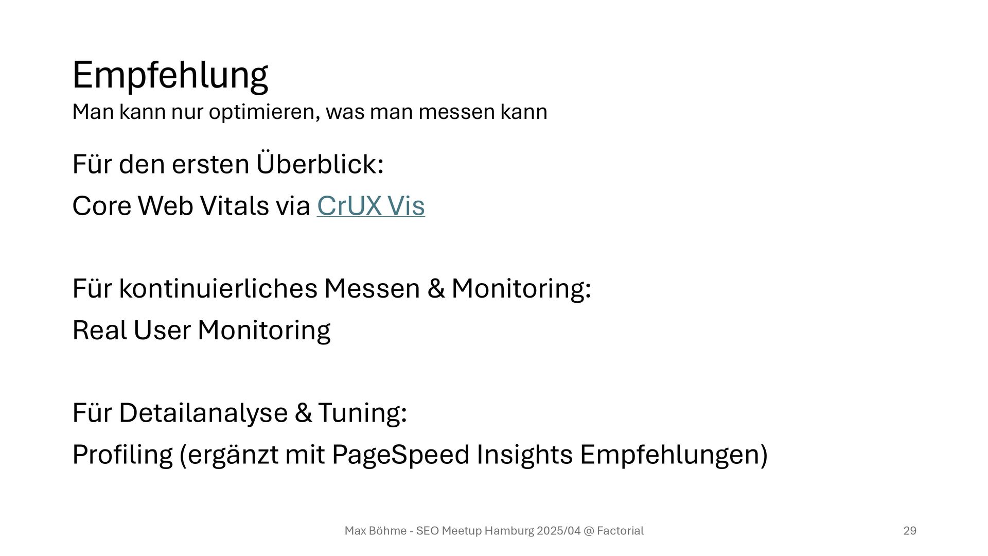 Vis Für kontinuierliches Messen & Monitoring: Real User Monitoring Für Detailanalyse & Tuning: Profiling (ergänzt mit PageSpeed Insights Empfehlungen) Max Böhme - SEO Meetup Hamburg 2025/04 @ Factorial 29 Man kann nur optimieren, was man messen kann