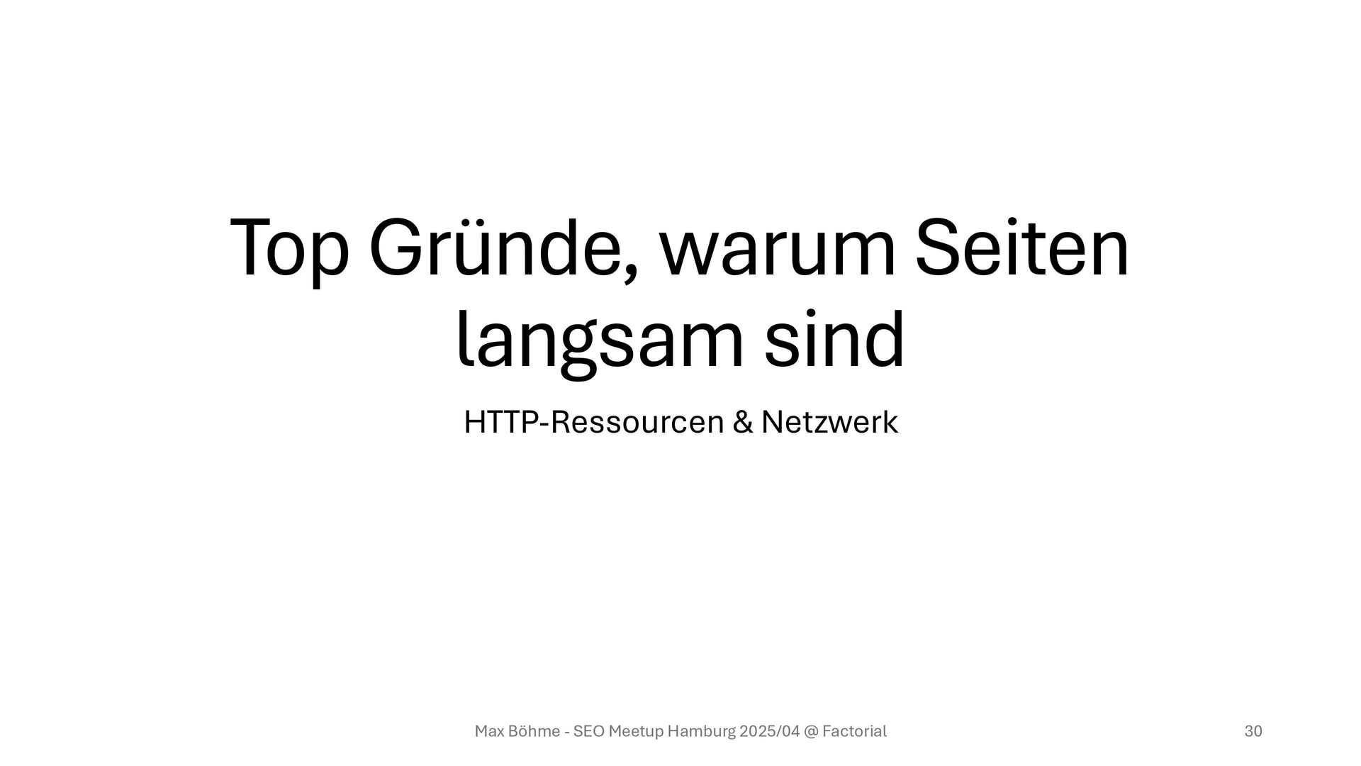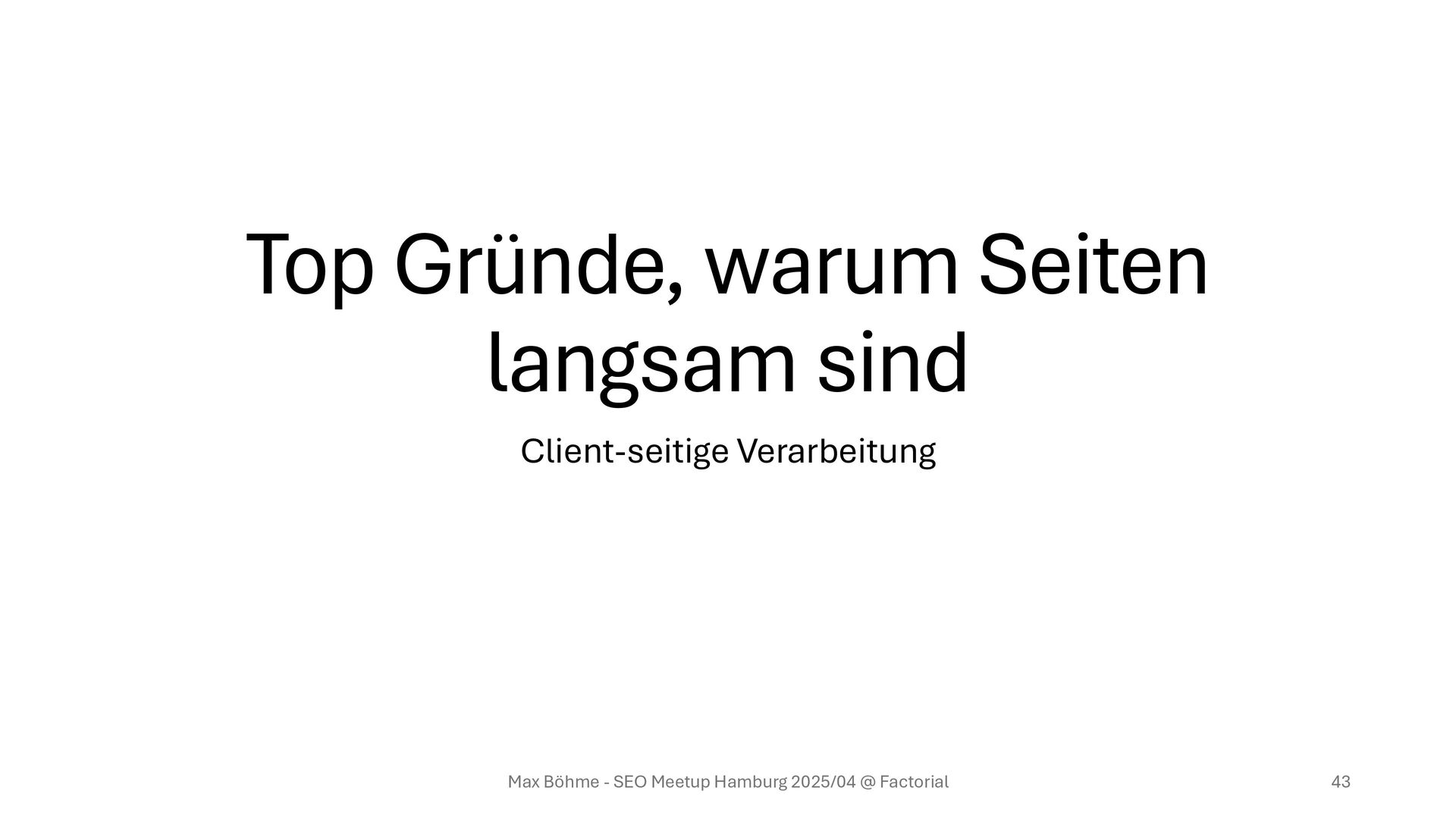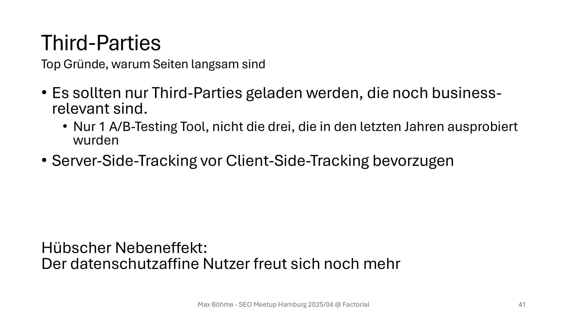 business- relevant sind. • Nur 1 A/B-Testing Tool, nicht die drei, die in den letzten Jahren ausprobiert wurden • Server-Side-Tracking vor Client-Side-Tracking bevorzugen Hübscher Nebeneffekt: Der datenschutzaffine Nutzer freut sich noch mehr Max Böhme - SEO Meetup Hamburg 2025/04 @ Factorial 41 Top Gründe, warum Seiten langsam sind