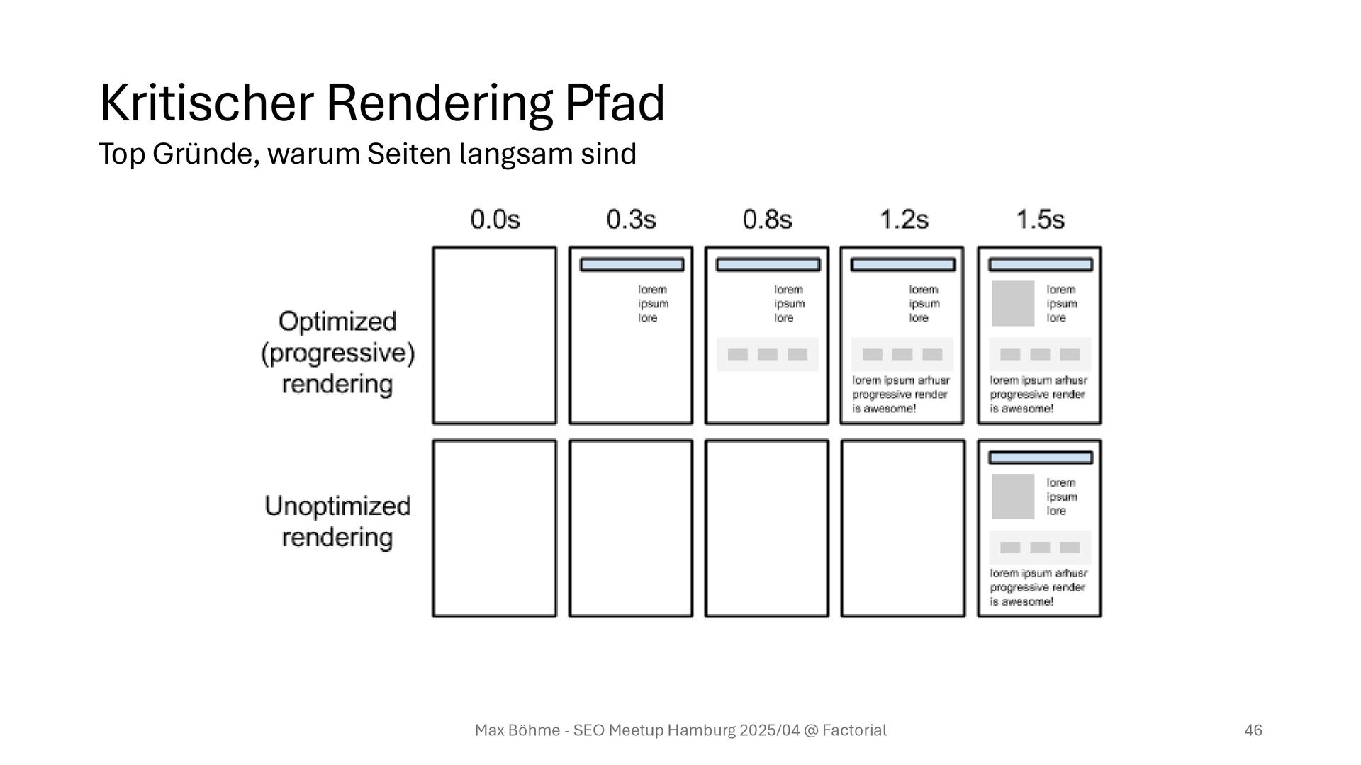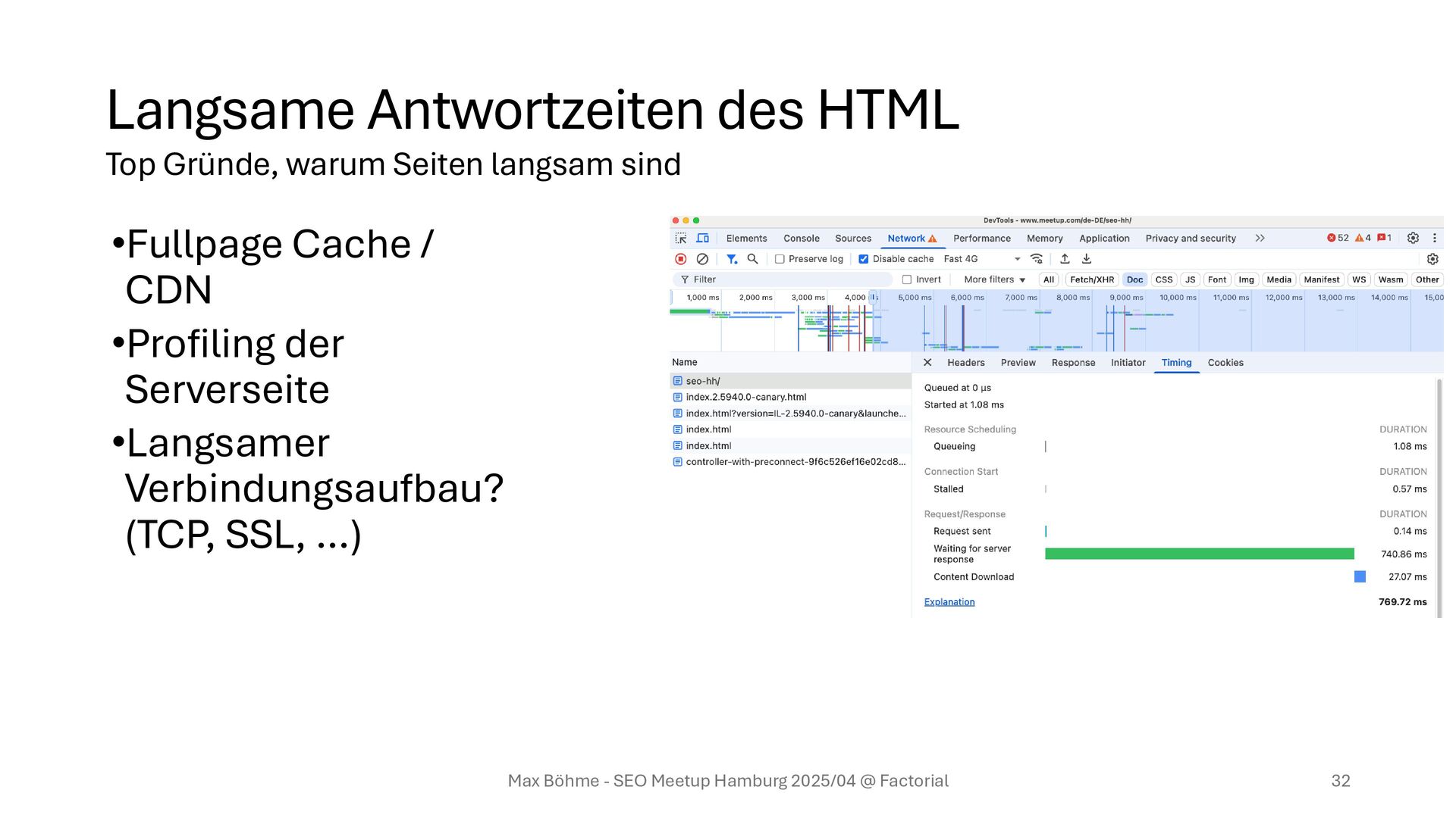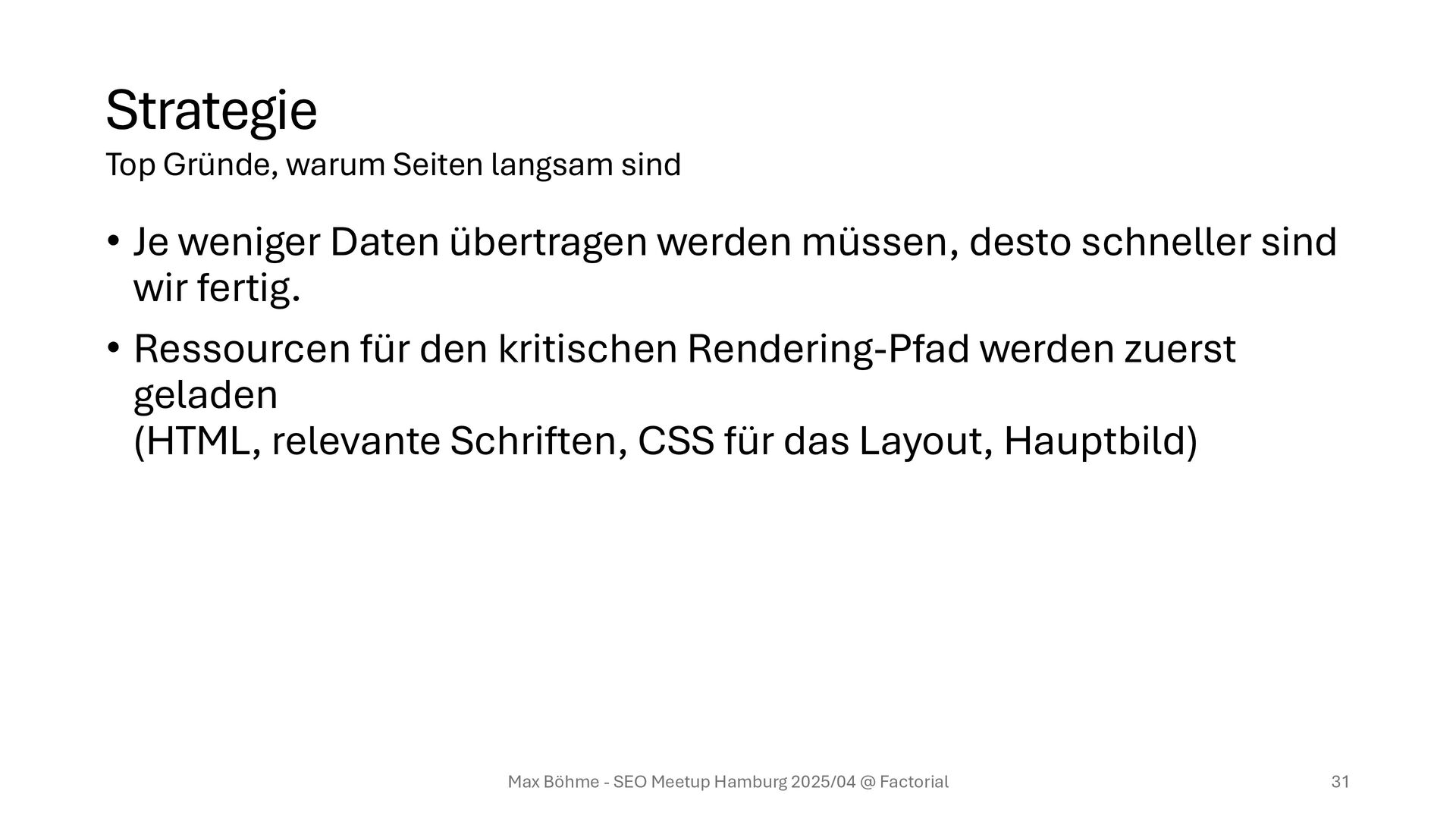 sind wir fertig. • Ressourcen für den kritischen Rendering-Pfad werden zuerst geladen (HTML, relevante Schriften, CSS für das Layout, Hauptbild) Max Böhme - SEO Meetup Hamburg 2025/04 @ Factorial 31 Top Gründe, warum Seiten langsam sind