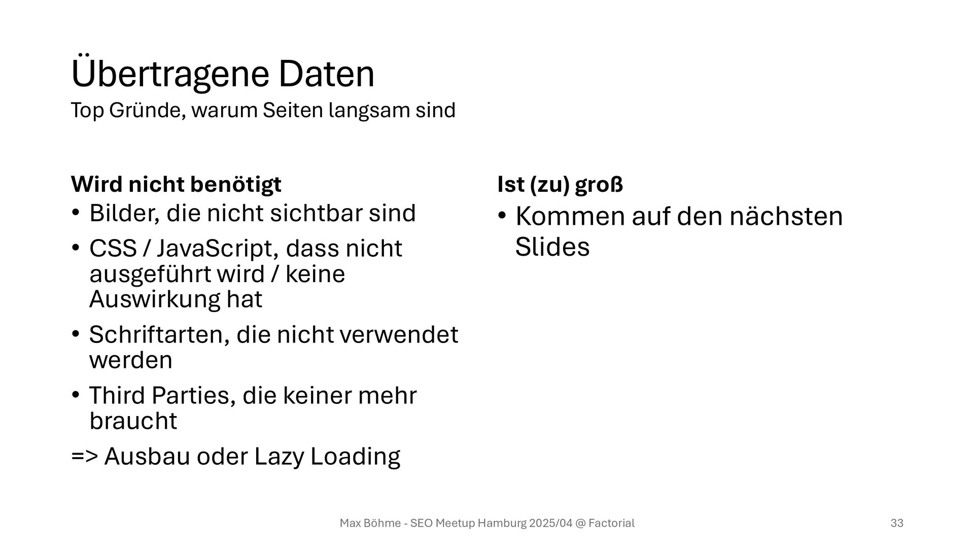 CSS / JavaScript, dass nicht ausgeführt wird / keine Auswirkung hat • Schriftarten, die nicht verwendet werden • Third Parties, die keiner mehr braucht => Ausbau oder Lazy Loading Ist (zu) groß • Kommen auf den nächsten Slides Max Böhme - SEO Meetup Hamburg 2025/04 @ Factorial 33 Übertragene Daten Top Gründe, warum Seiten langsam sind