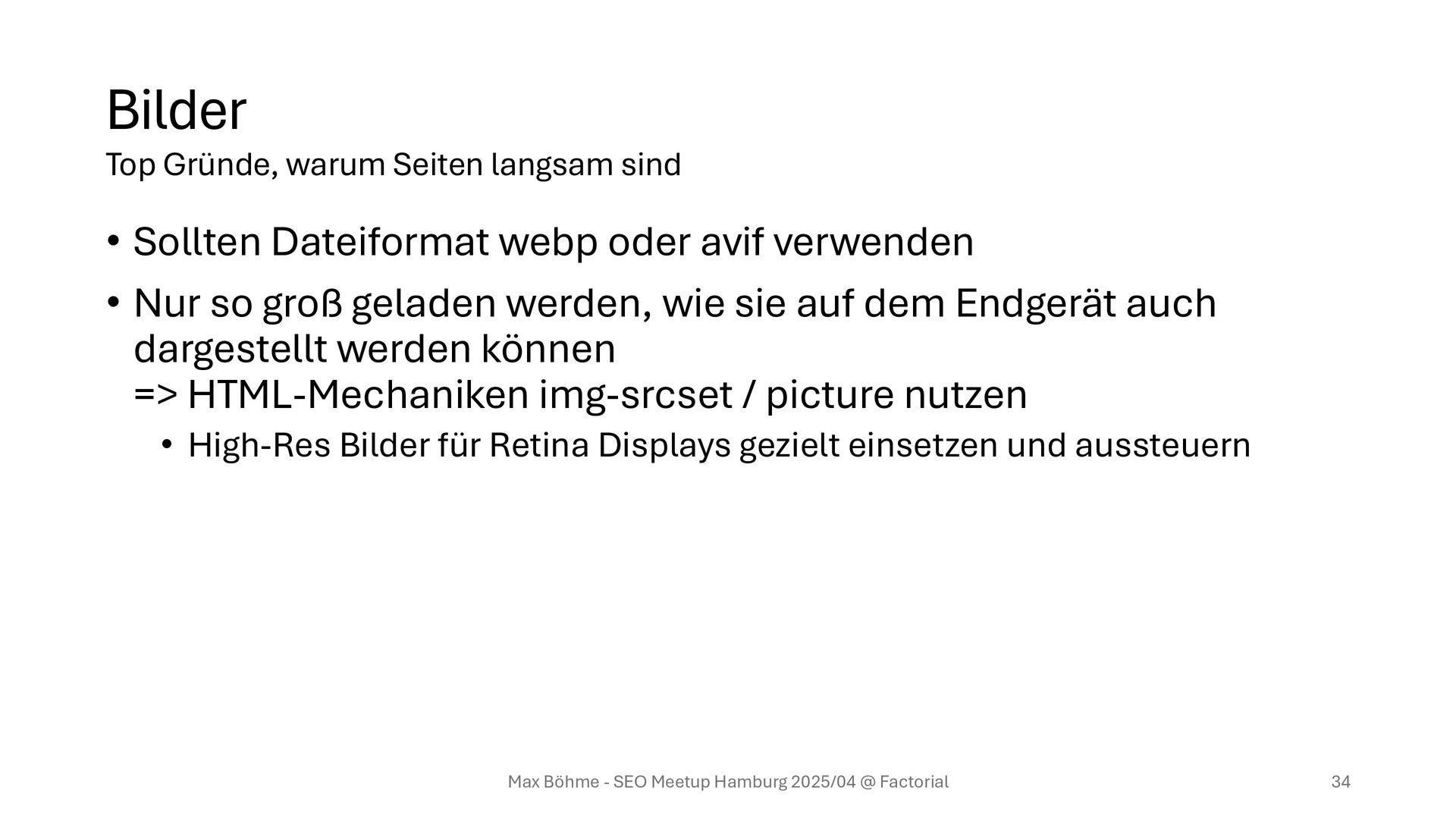 so groß geladen werden, wie sie auf dem Endgerät auch dargestellt werden können => HTML-Mechaniken img-srcset / picture nutzen • High-Res Bilder für Retina Displays gezielt einsetzen und aussteuern Max Böhme - SEO Meetup Hamburg 2025/04 @ Factorial 34 Top Gründe, warum Seiten langsam sind