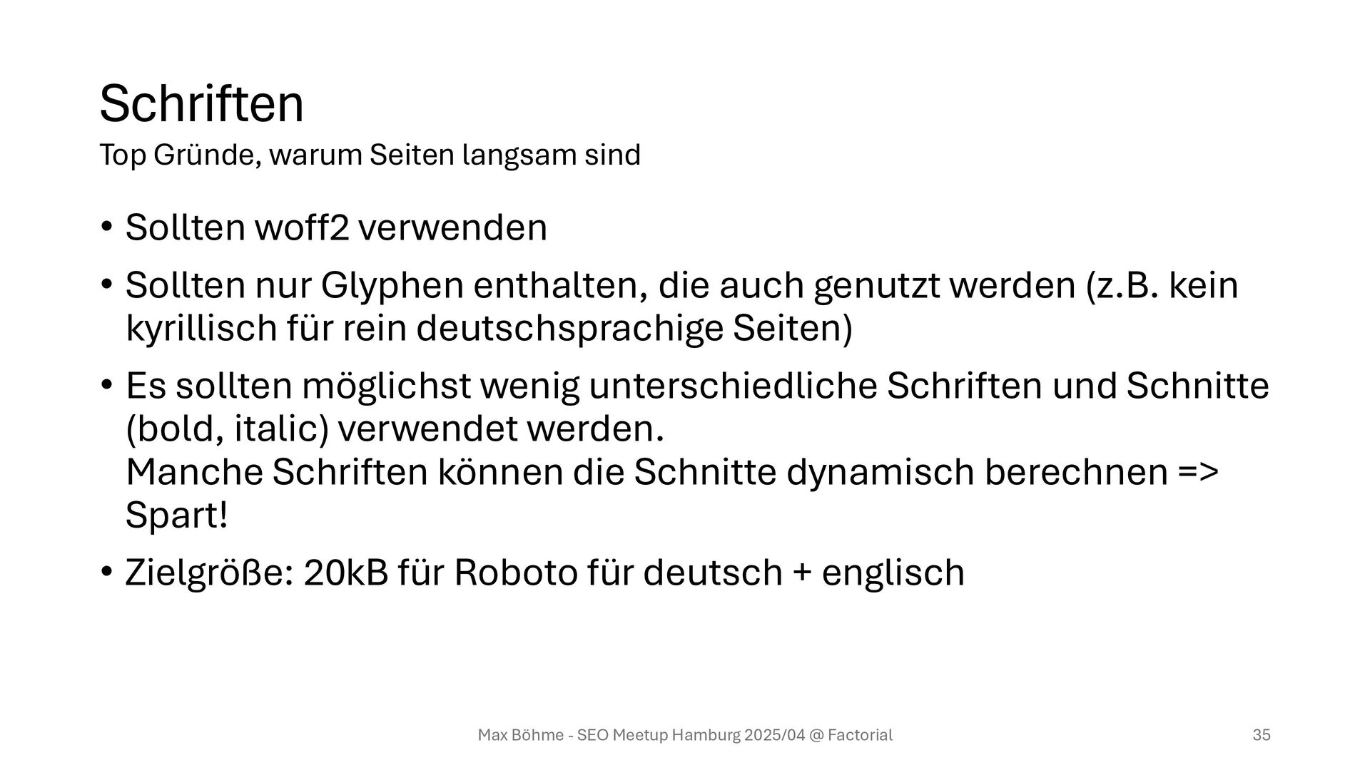 die auch genutzt werden (z.B. kein kyrillisch für rein deutschsprachige Seiten) • Es sollten möglichst wenig unterschiedliche Schriften und Schnitte (bold, italic) verwendet werden. Manche Schriften können die Schnitte dynamisch berechnen => Spart! • Zielgröße: 20kB für Roboto für deutsch + englisch Max Böhme - SEO Meetup Hamburg 2025/04 @ Factorial 35 Top Gründe, warum Seiten langsam sind