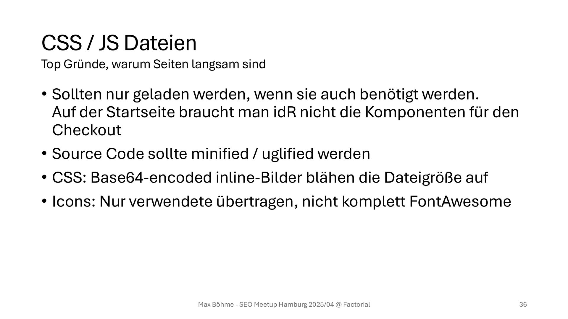 sie auch benötigt werden. Auf der Startseite braucht man idR nicht die Komponenten für den Checkout • Source Code sollte minified / uglified werden • CSS: Base64-encoded inline-Bilder blähen die Dateigröße auf • Icons: Nur verwendete übertragen, nicht komplett FontAwesome Max Böhme - SEO Meetup Hamburg 2025/04 @ Factorial 36 Top Gründe, warum Seiten langsam sind