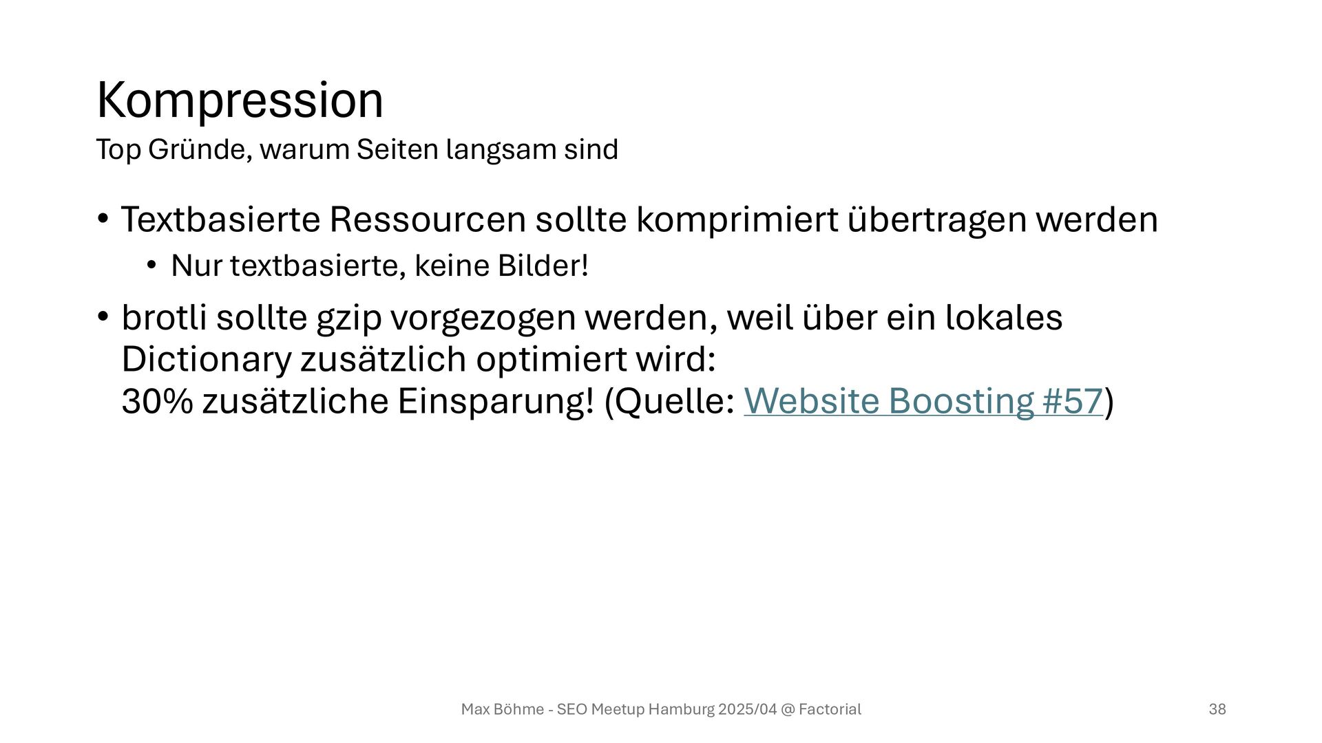textbasierte, keine Bilder! • brotli sollte gzip vorgezogen werden, weil über ein lokales Dictionary zusätzlich optimiert wird: 30% zusätzliche Einsparung! (Quelle: Website Boosting #57) Max Böhme - SEO Meetup Hamburg 2025/04 @ Factorial 38 Top Gründe, warum Seiten langsam sind