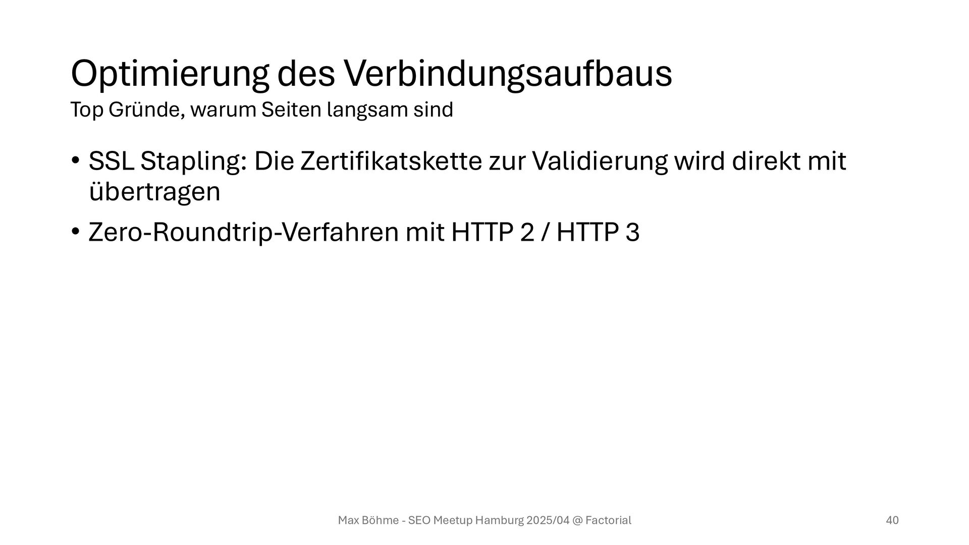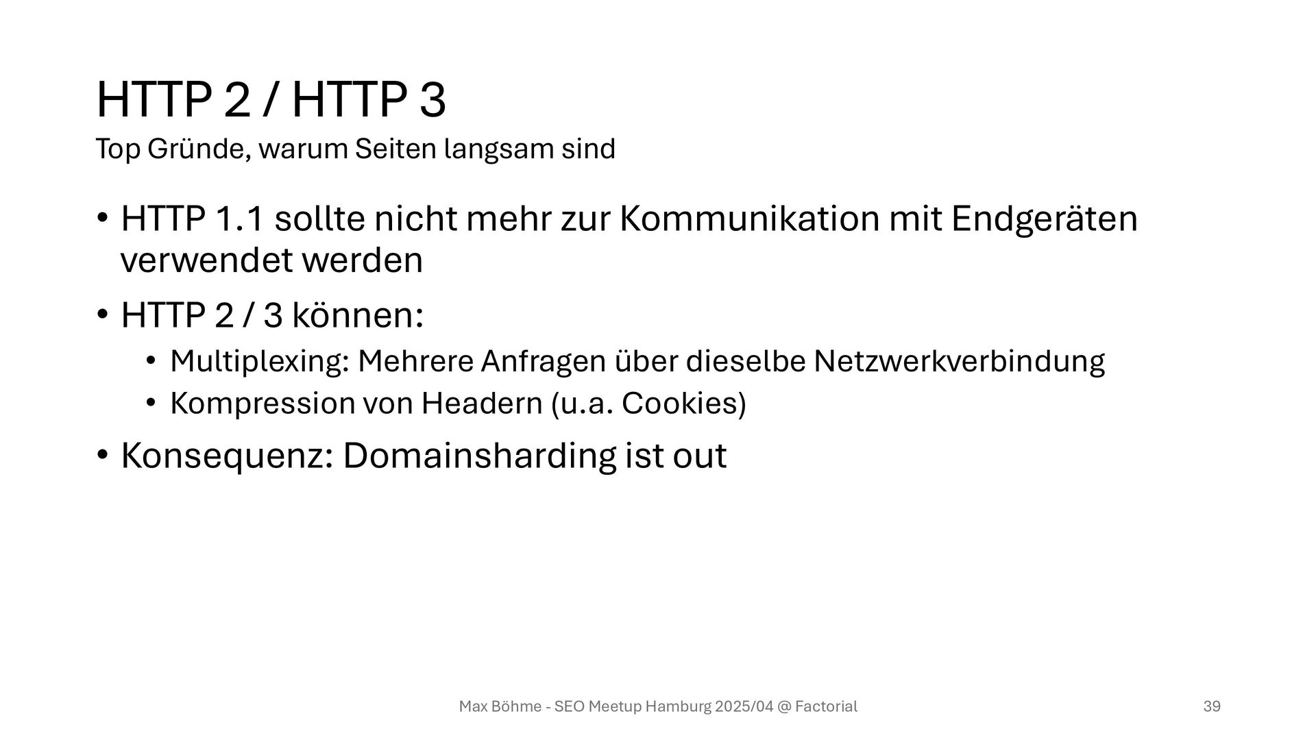 mehr zur Kommunikation mit Endgeräten verwendet werden • HTTP 2 / 3 können: • Multiplexing: Mehrere Anfragen über dieselbe Netzwerkverbindung • Kompression von Headern (u.a. Cookies) • Konsequenz: Domainsharding ist out Max Böhme - SEO Meetup Hamburg 2025/04 @ Factorial 39 Top Gründe, warum Seiten langsam sind