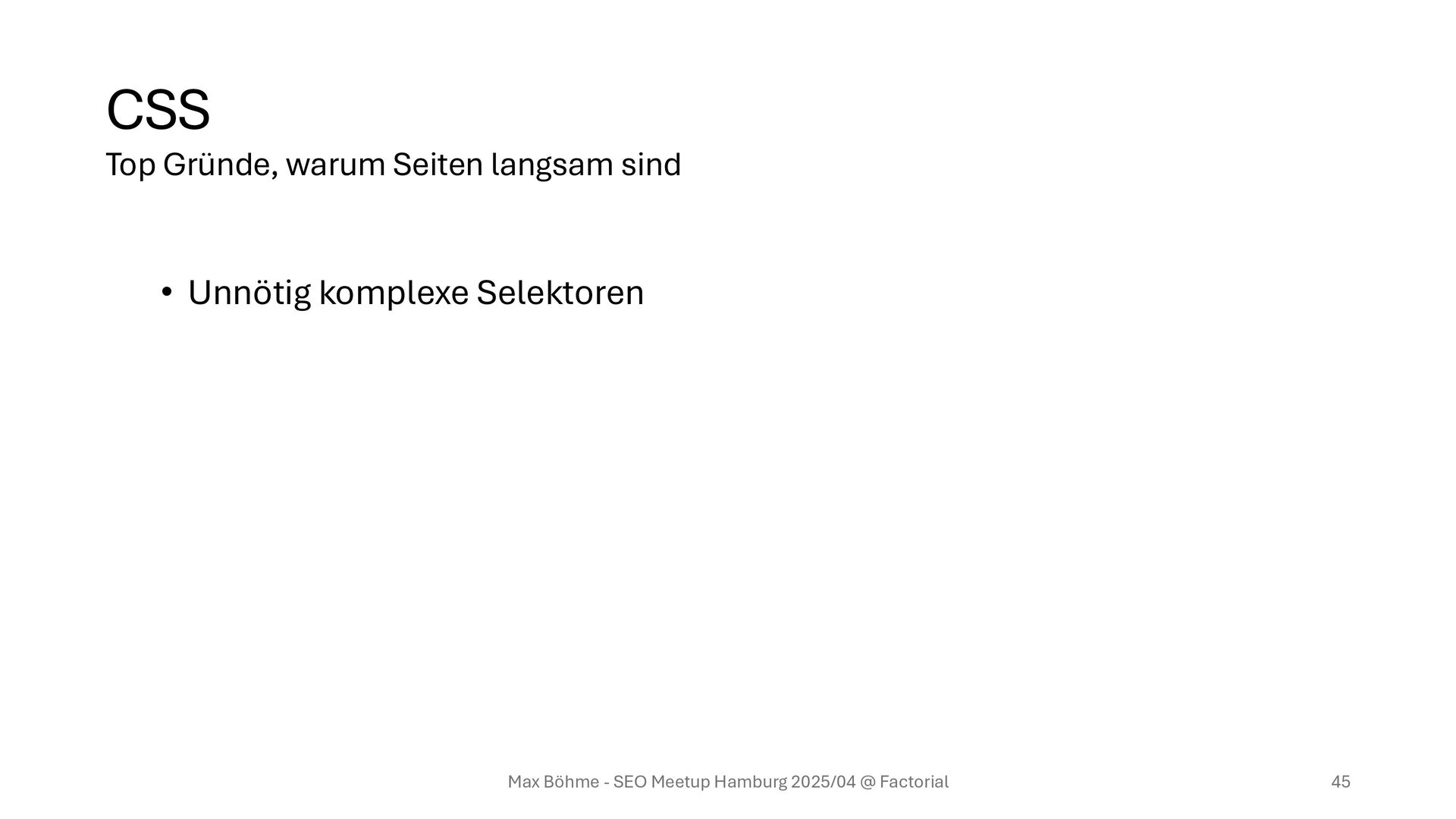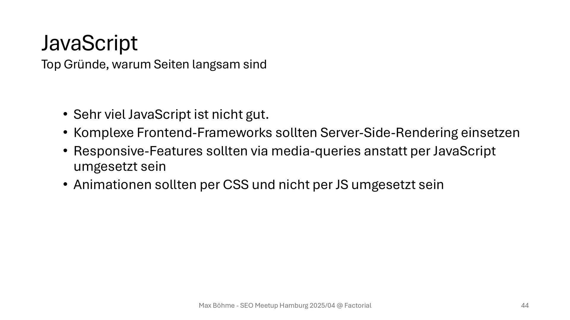 Frontend-Frameworks sollten Server-Side-Rendering einsetzen • Responsive-Features sollten via media-queries anstatt per JavaScript umgesetzt sein • Animationen sollten per CSS und nicht per JS umgesetzt sein Max Böhme - SEO Meetup Hamburg 2025/04 @ Factorial 44 Top Gründe, warum Seiten langsam sind