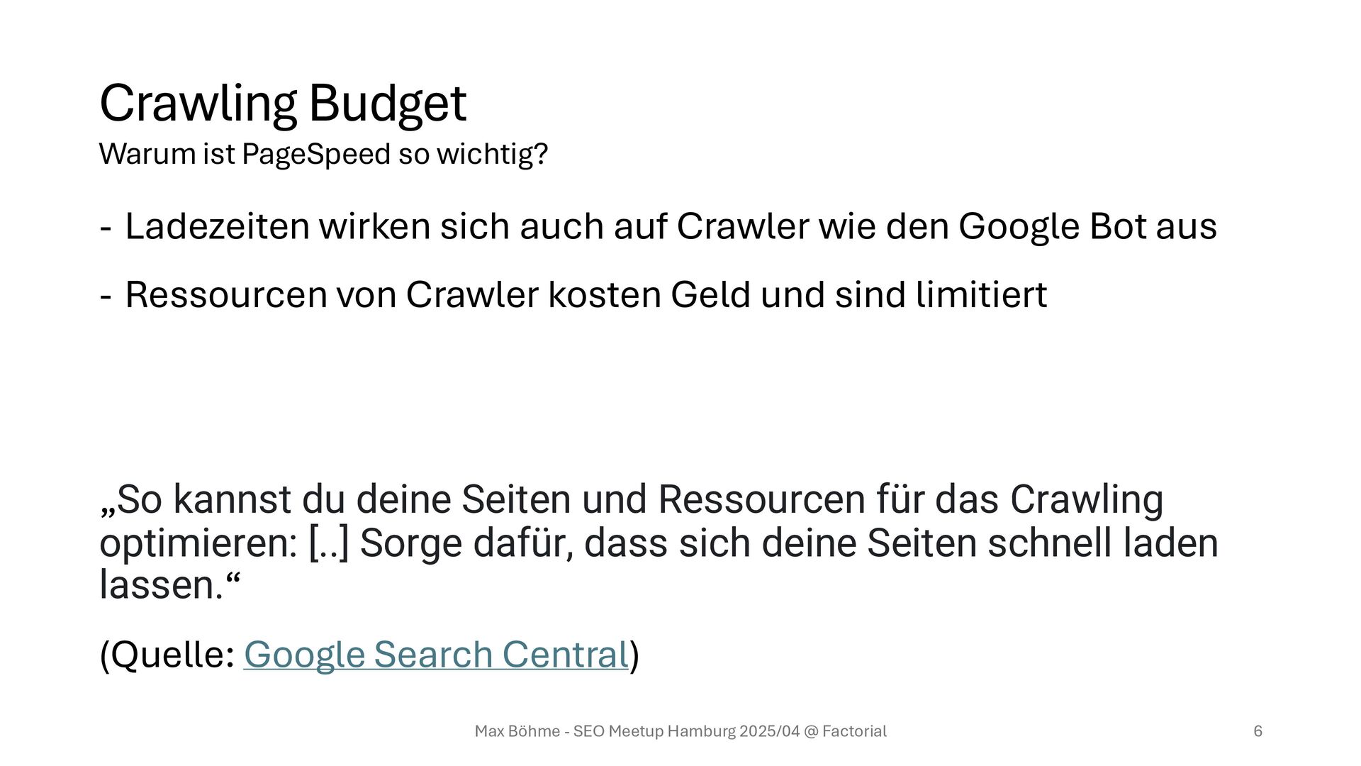 den Google Bot aus - Ressourcen von Crawler kosten Geld und sind limitiert „So kannst du deine Seiten und Ressourcen für das Crawling optimieren: [..] Sorge dafür, dass sich deine Seiten schnell laden lassen.“ (Quelle: Google Search Central) Max Böhme - SEO Meetup Hamburg 2025/04 @ Factorial 6 Warum ist PageSpeed so wichtig?