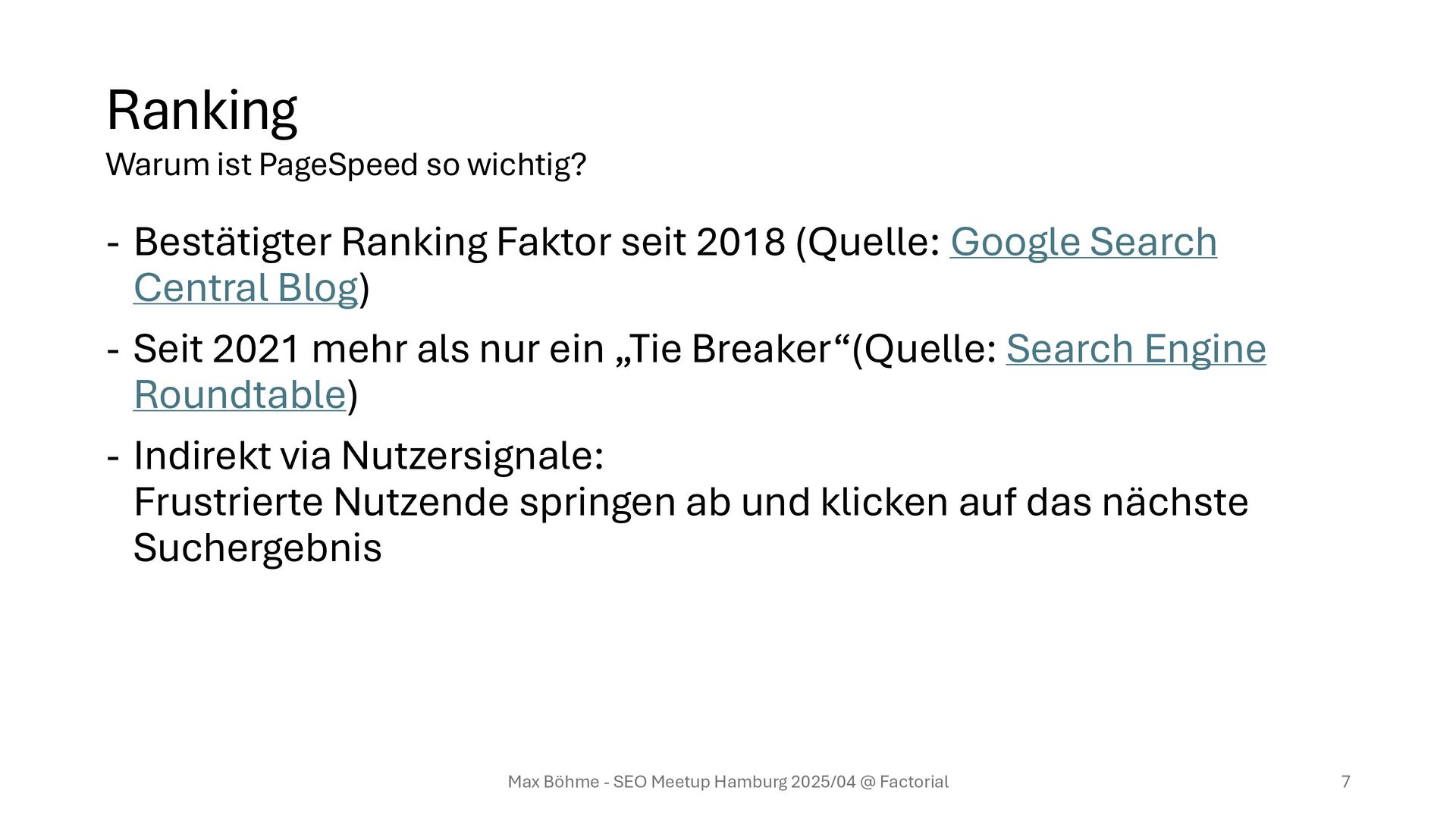 Central Blog) - Seit 2021 mehr als nur ein „Tie Breaker“(Quelle: Search Engine Roundtable) - Indirekt via Nutzersignale: Frustrierte Nutzende springen ab und klicken auf das nächste Suchergebnis Max Böhme - SEO Meetup Hamburg 2025/04 @ Factorial 7 Warum ist PageSpeed so wichtig?