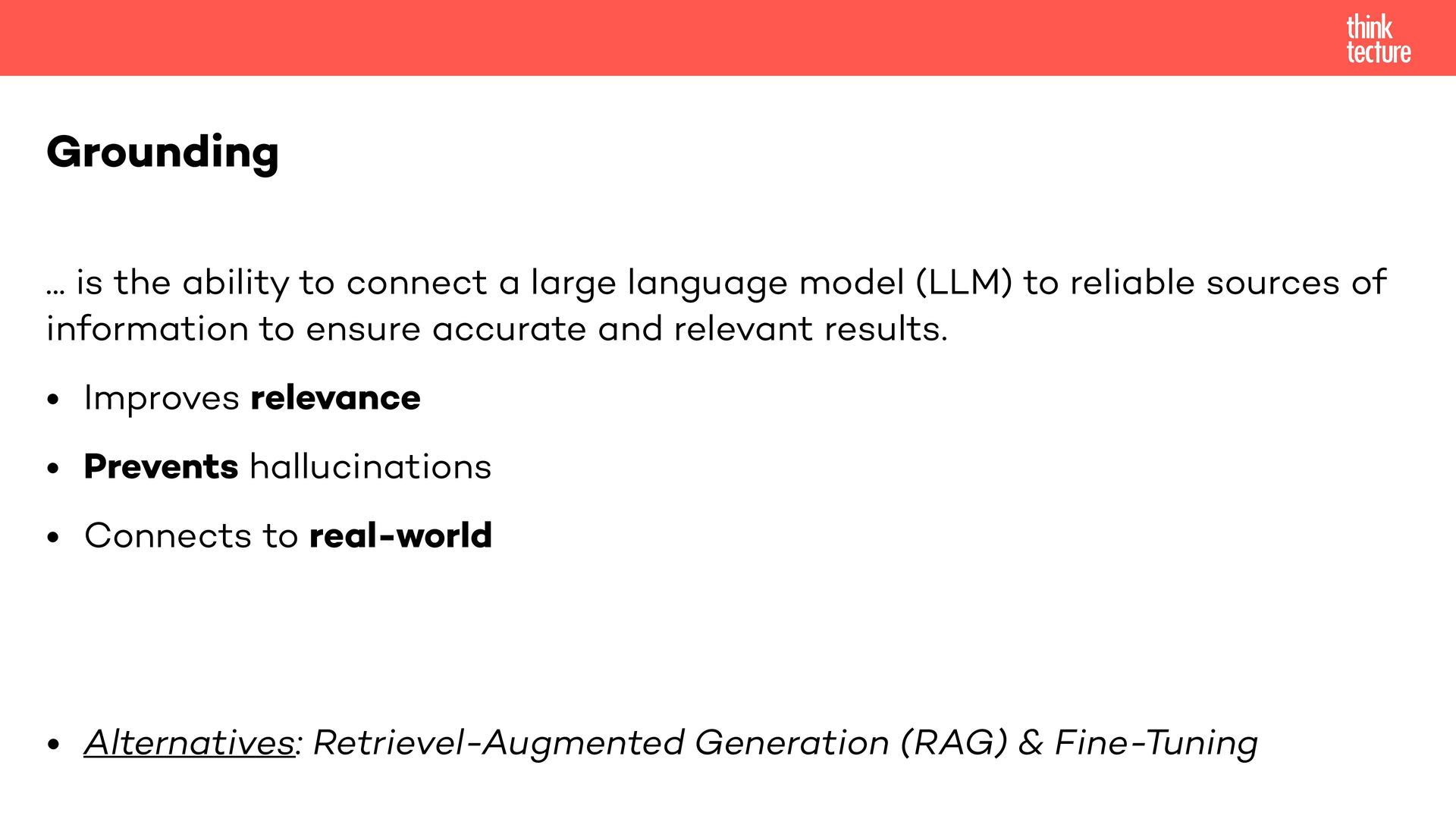 (LLM) to reliable sources of information to ensure accurate and relevant results. • Improves relevance • Prevents hallucinations • Connects to real-world • Alternatives: Retrievel-Augmented Generation (RAG) & Fine-Tuning Grounding